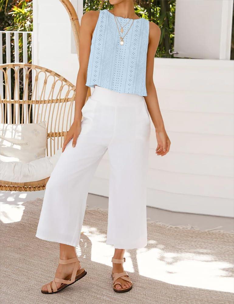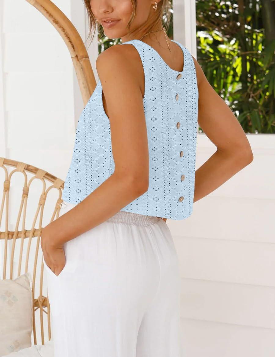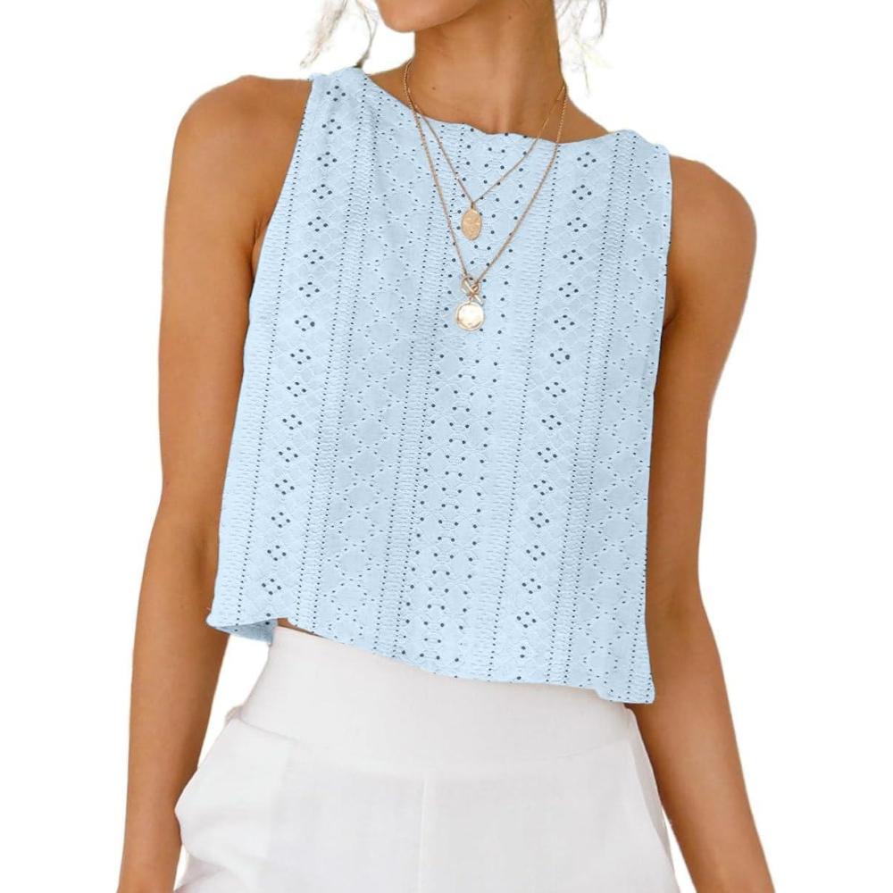 IDEALSANXUN Eyelet Tank Tops for Women Spring Summer Cute Cropped Sleeveless Shirts Blouses(Blue)