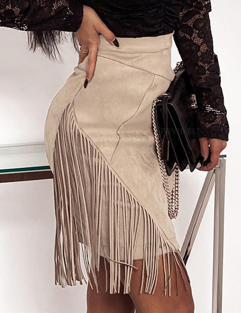 IDEALSANXUN Fringe Suede Skirt for Women High Waisted Fall Winter Tassel Short Mini Skirt 2025(Beige)