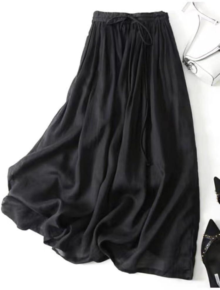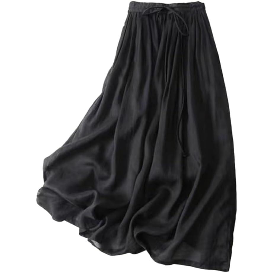 IDEALSANXUN Linen Skirts for Women Spring Summer A Line Drawstring Elastic High Waisted Casual Cute Trendy Flowy Midi Skirt(Black)