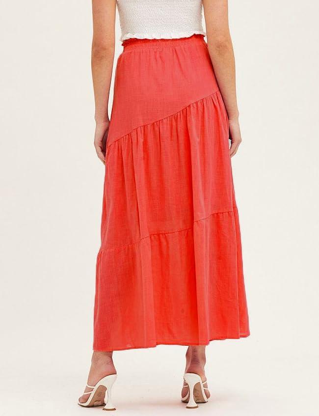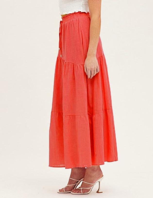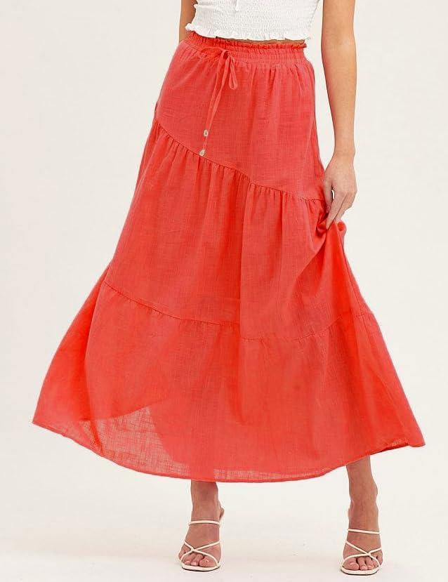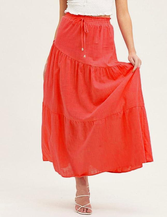 IDEALSANXUN Linen Skirts for Women Spring Summer A Line Elastic High Waisted Casual Drawstring Flowy Tiered Midi Skirt(Orange)
