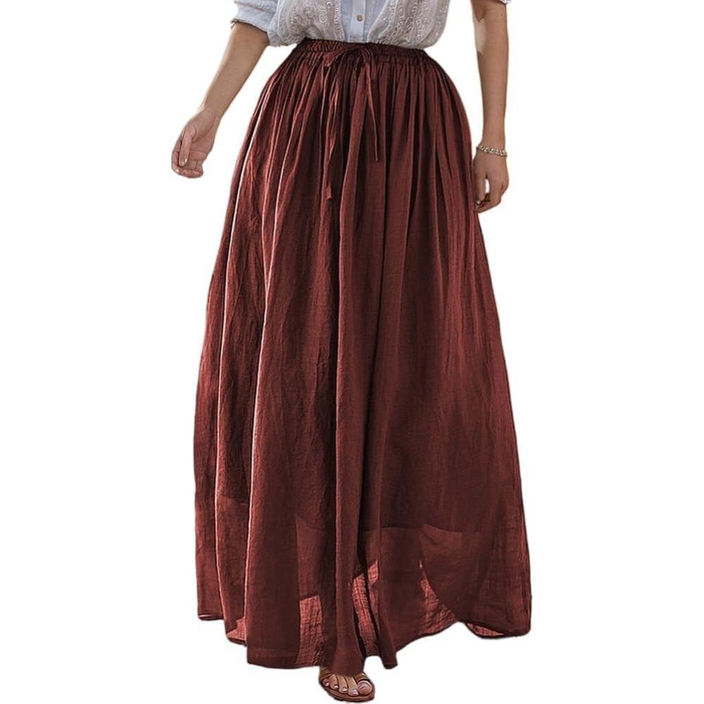 IDEALSANXUN Linen Skirts for Women Spring Summer Outfits A Line Elastic High Waisted Casual Lightweight Flowy Midi Skirt(Wine)