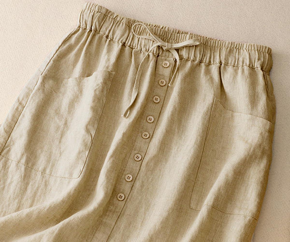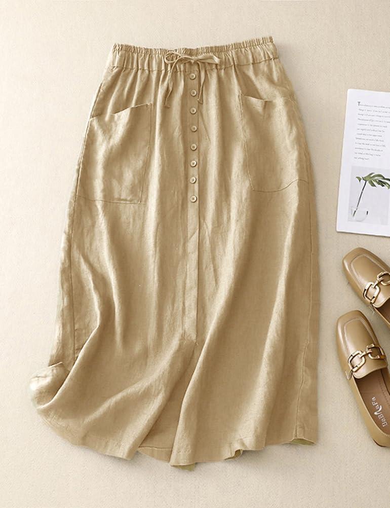 IDEALSANXUN Linen Skirts for Women Summer A Line Flowy Casual Drawstring High Waist Button Down Midi Skirts with Slit(Khaki)