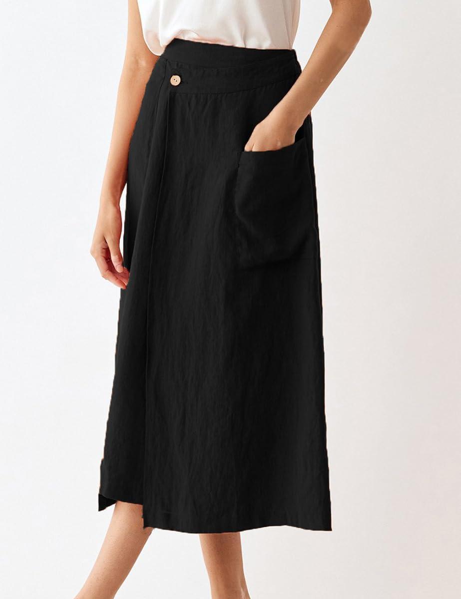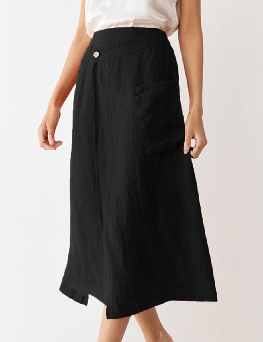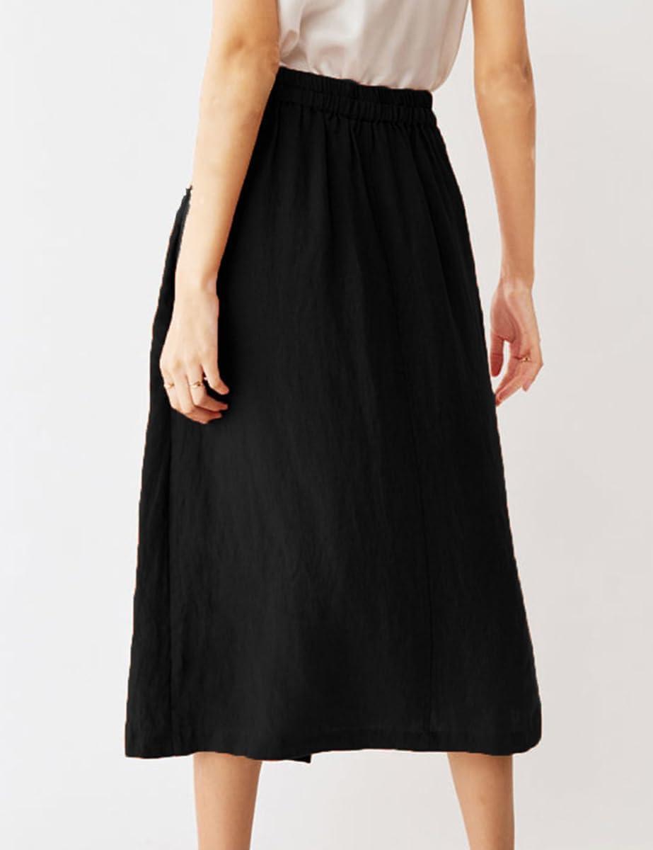 IDEALSANXUN Linen Skirts for Women Summer Casual Cotton A Line Elastic High Waisted Midi Skirts with Pockets(Black)