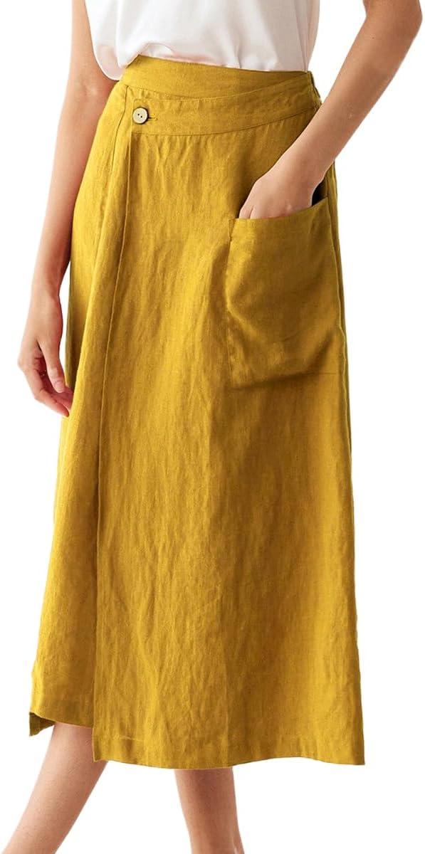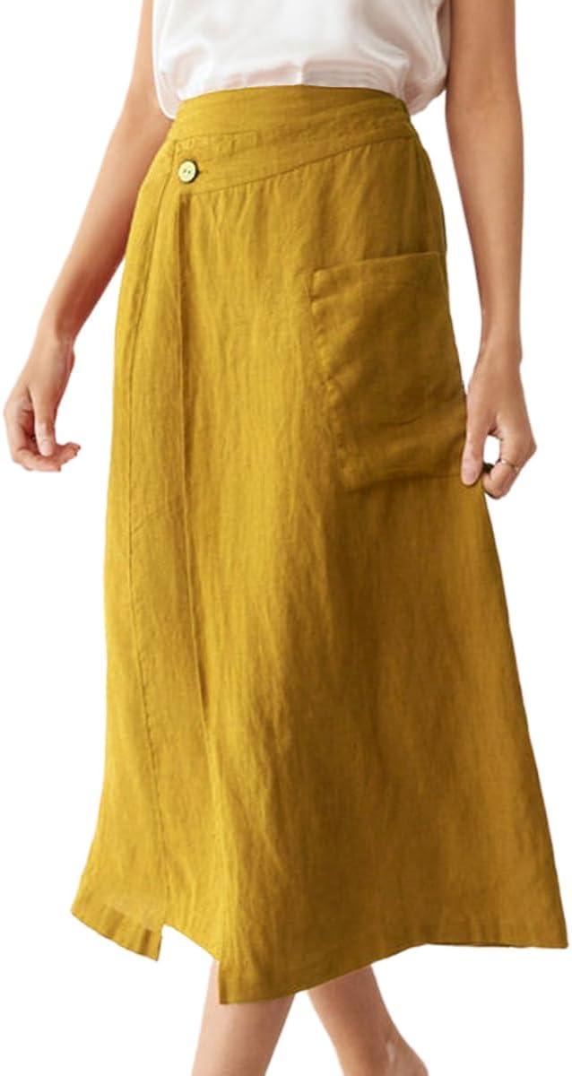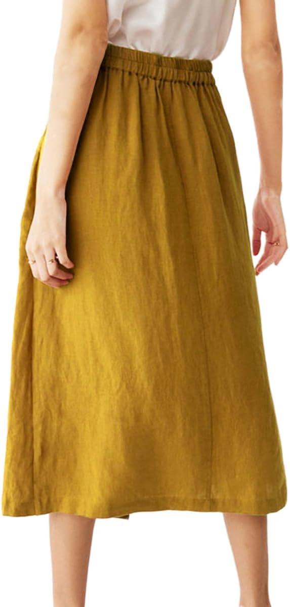 IDEALSANXUN Linen Skirts for Women Summer Casual Cotton A Line Elastic High Waisted Midi Skirts with Pockets(Yellow)