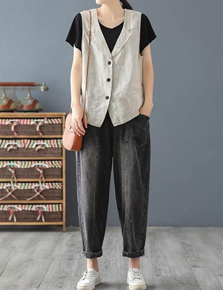 IDEALSANXUN Linen Vest for Women Casual Sleeveless Spring Summer Blazer Jackets(Black)