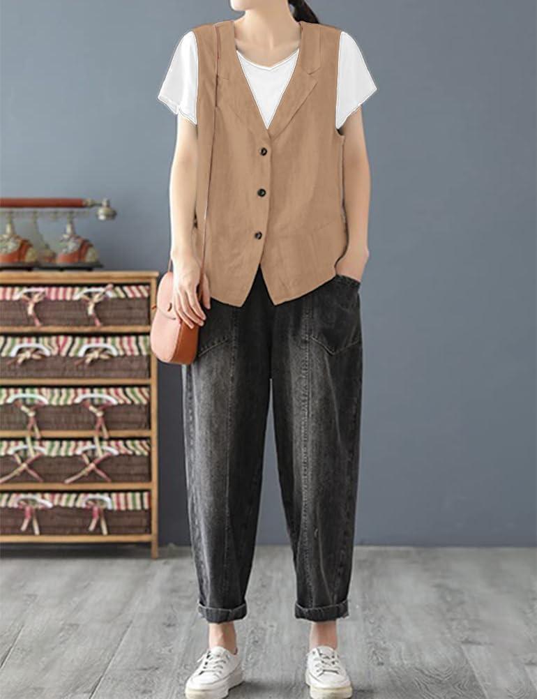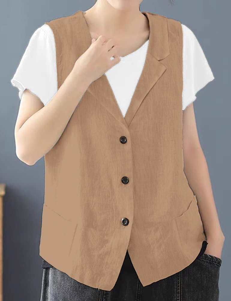 IDEALSANXUN Linen Vest for Women Casual Sleeveless Spring Summer Blazer Jackets(Khaki)