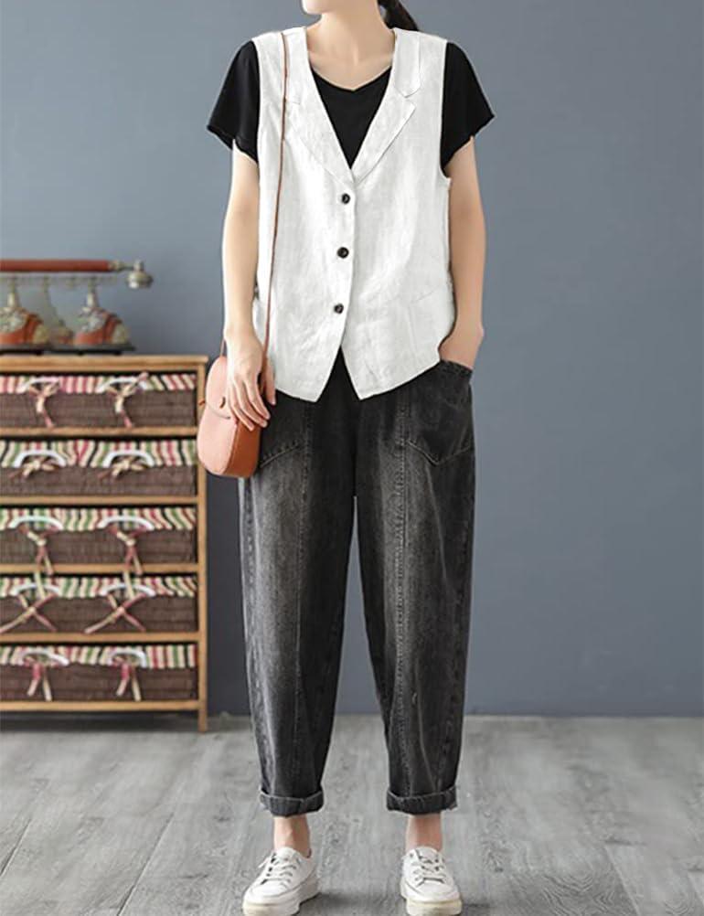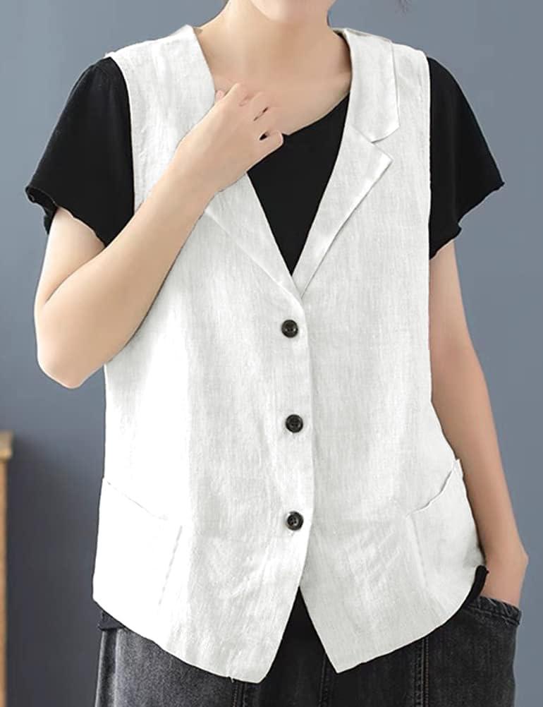 IDEALSANXUN Linen Vest for Women Casual Sleeveless Spring Summer Blazer Jackets(White)