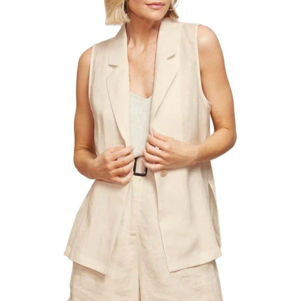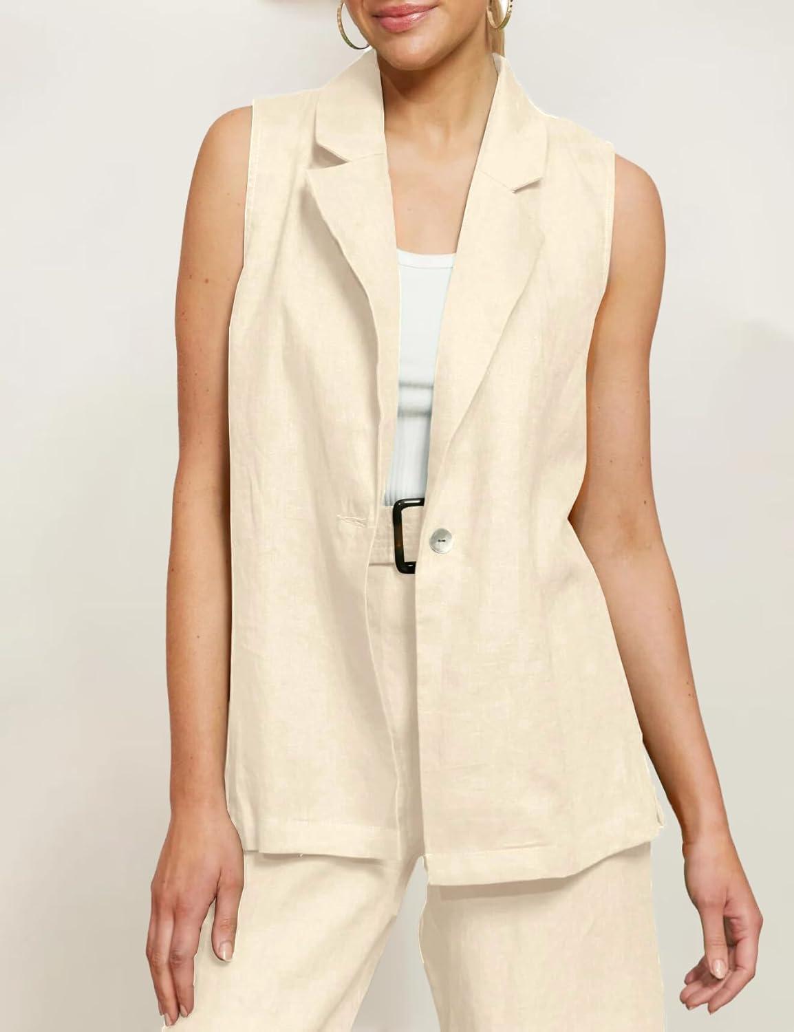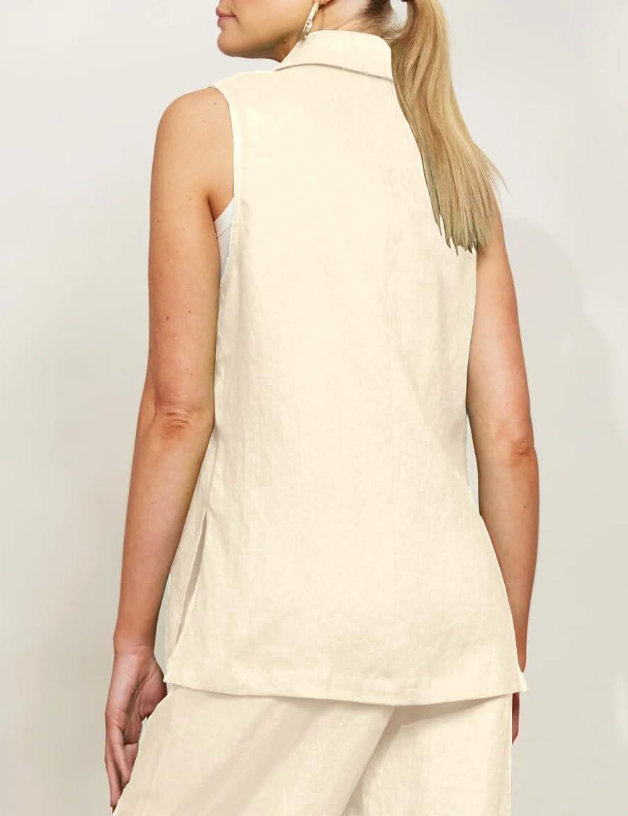 IDEALSANXUN Linen Vest Women Spring Summer Sleeveless Blazer Jackets Casual Lightweight Cardigan Vest Top Waistcoat(Beige)