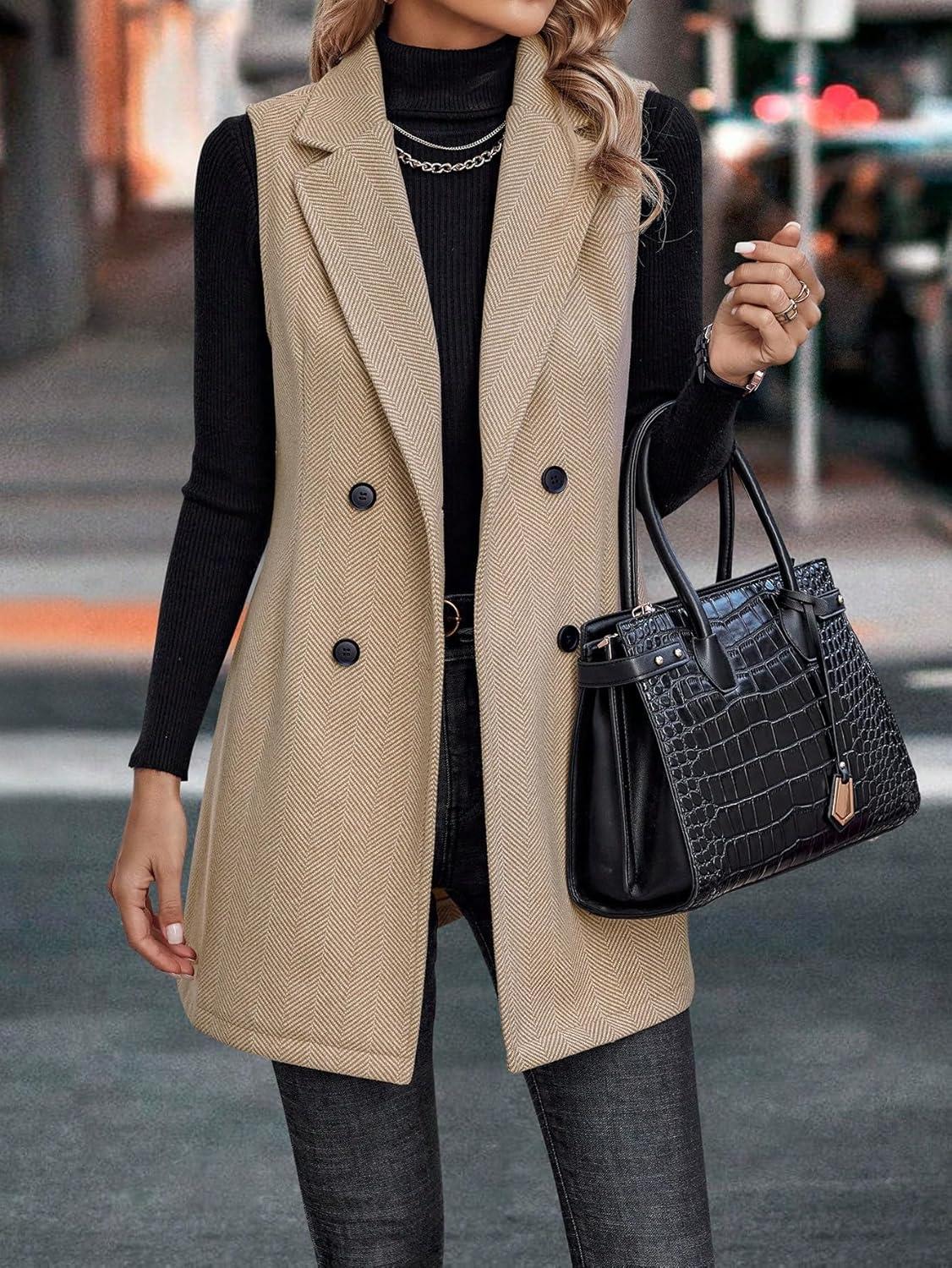 IDEALSANXUN Long Vest for Women Sleeveless Tweed Blazer Fall Jackets Cardigan Outerwear(Khaki)