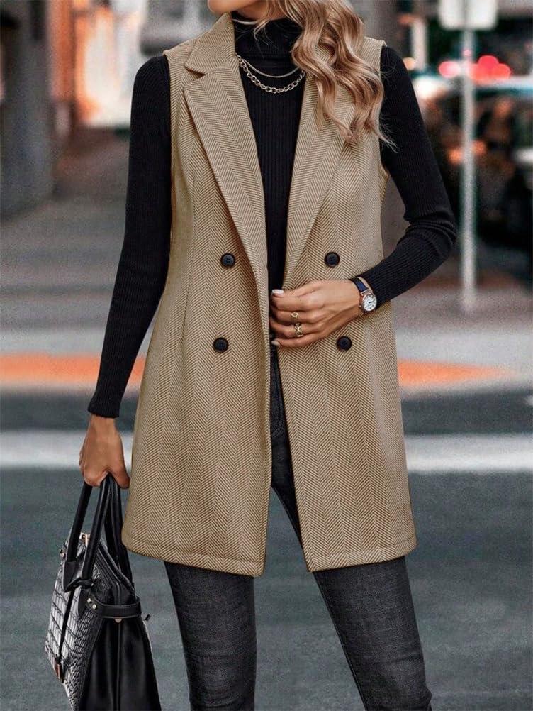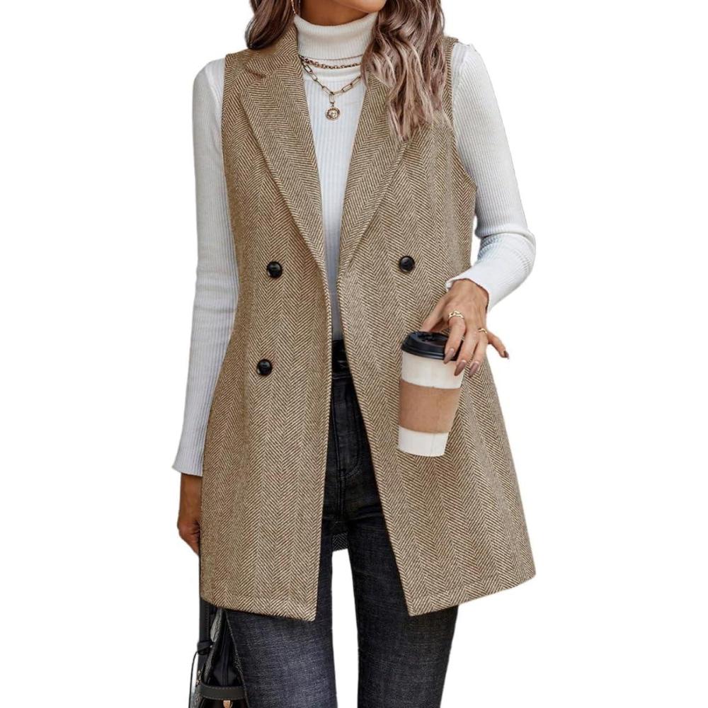 IDEALSANXUN Long Vest for Women Sleeveless Tweed Blazer Fall Jackets Cardigan Outerwear(Khaki)