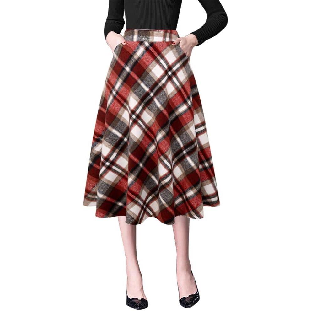 IDEALSANXUN Plaid Skirts for Womens Fall Winter High Waist Aline Pleated Midi Skirts(Wine)