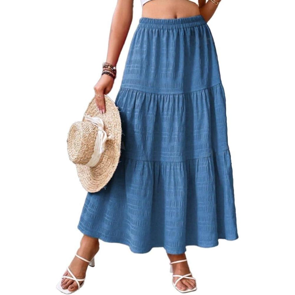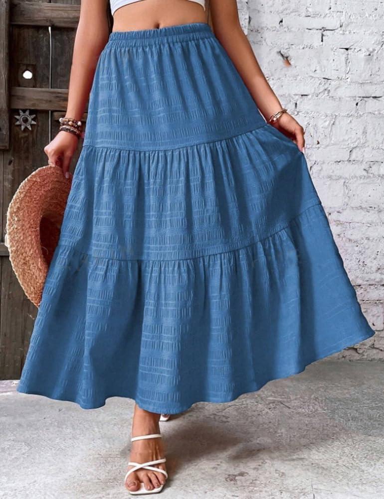 IDEALSANXUN Tiered Skirt Women Spring Summer Elastic High Waisted Flowy A Line Pleated Long Maxi Skirts(Navy)