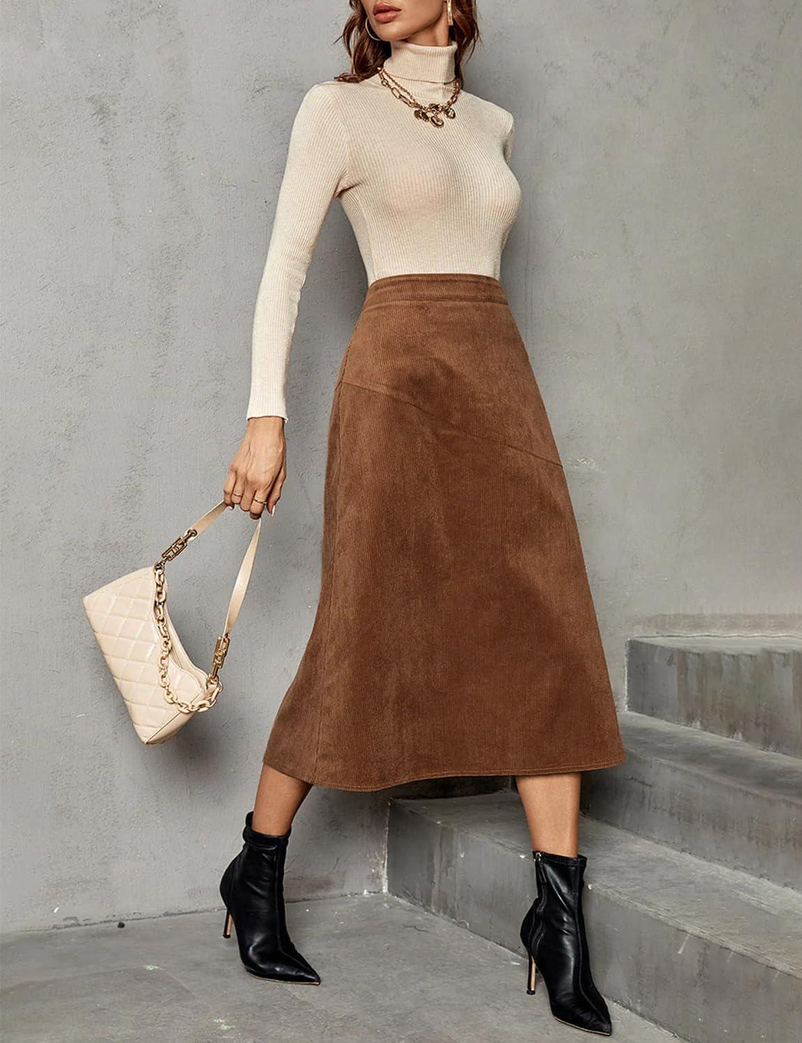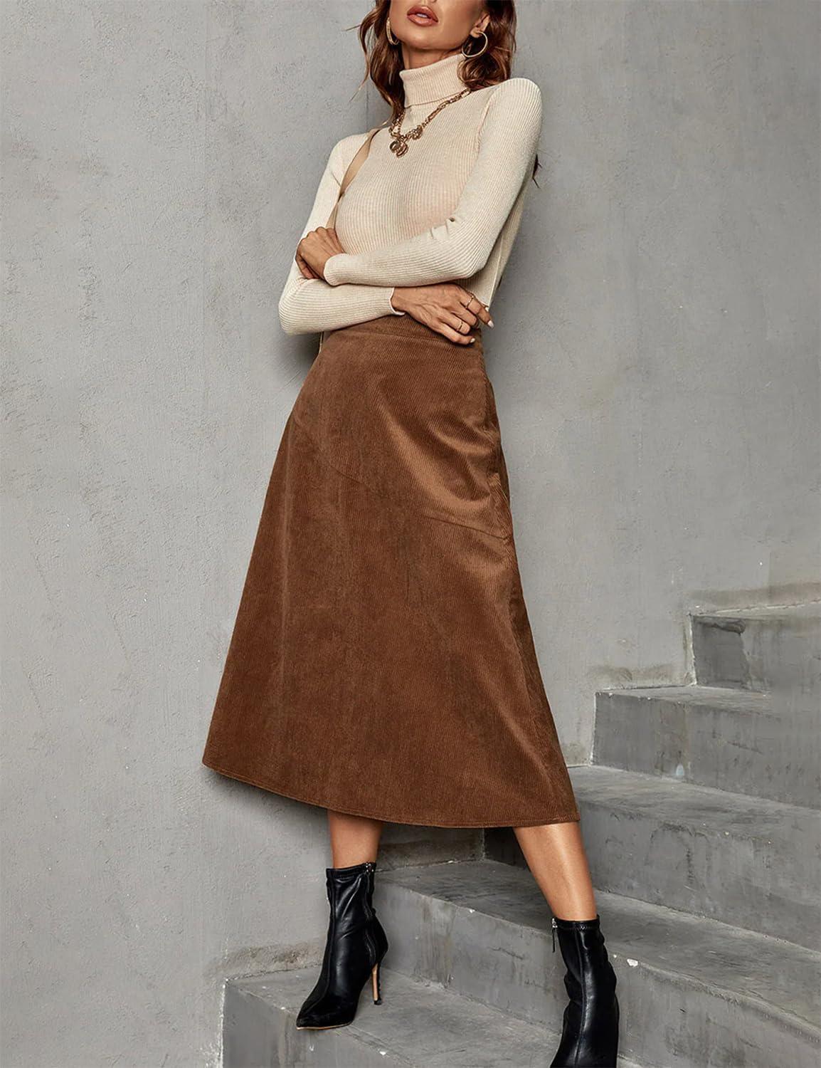 IDEALSANXUN Womens Corduroy Skirt Fall Winter High Waisted A Line Midi Skirt(Brown)