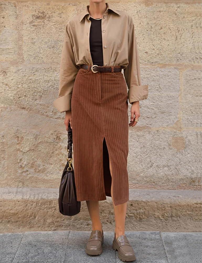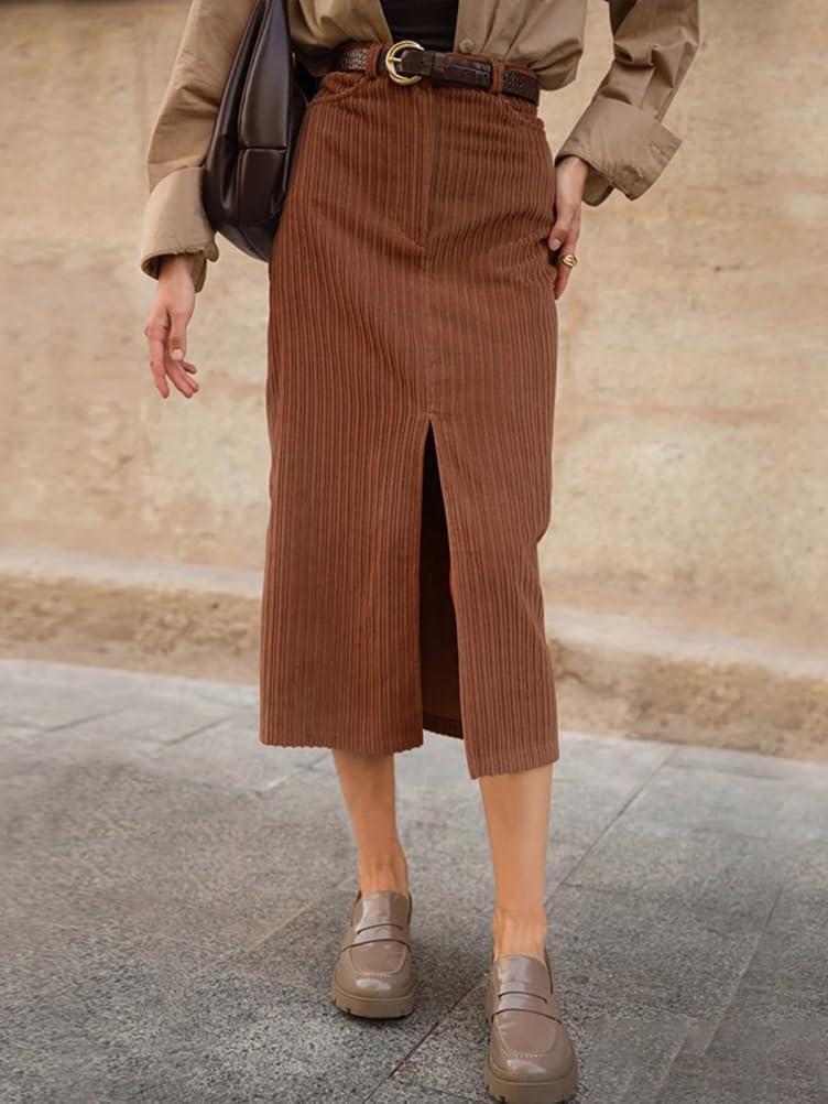 IDEALSANXUN Womens Corduroy Skirt Fall Winter High Waisted Bodycon Midi Pencil Skirt with Front Slit(Brown)