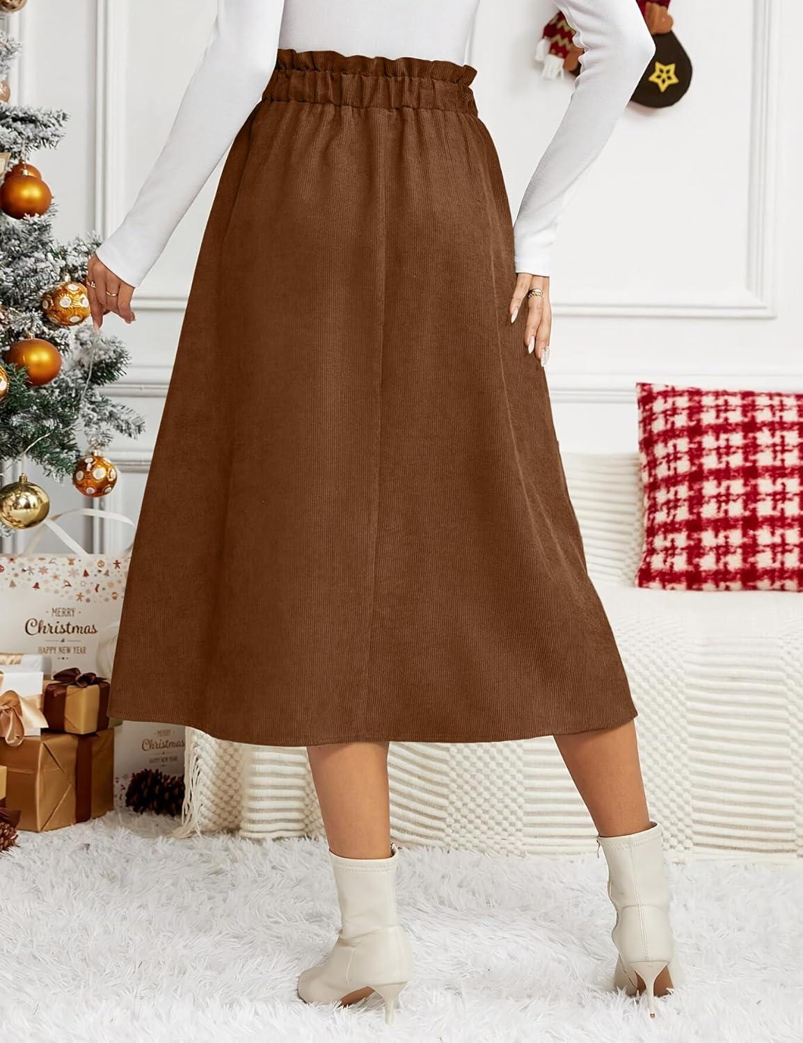 IDEALSANXUN Womens Corduroy Skirts Fall Winter High Waisted A Line Pleated Midi Skirt(Brown)