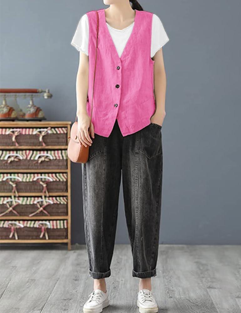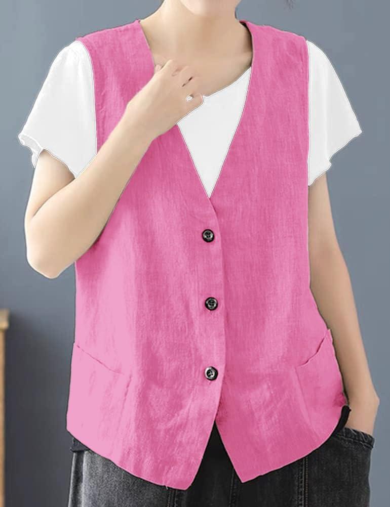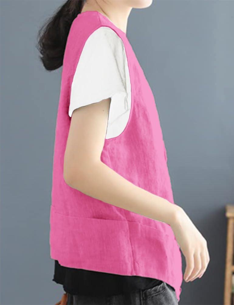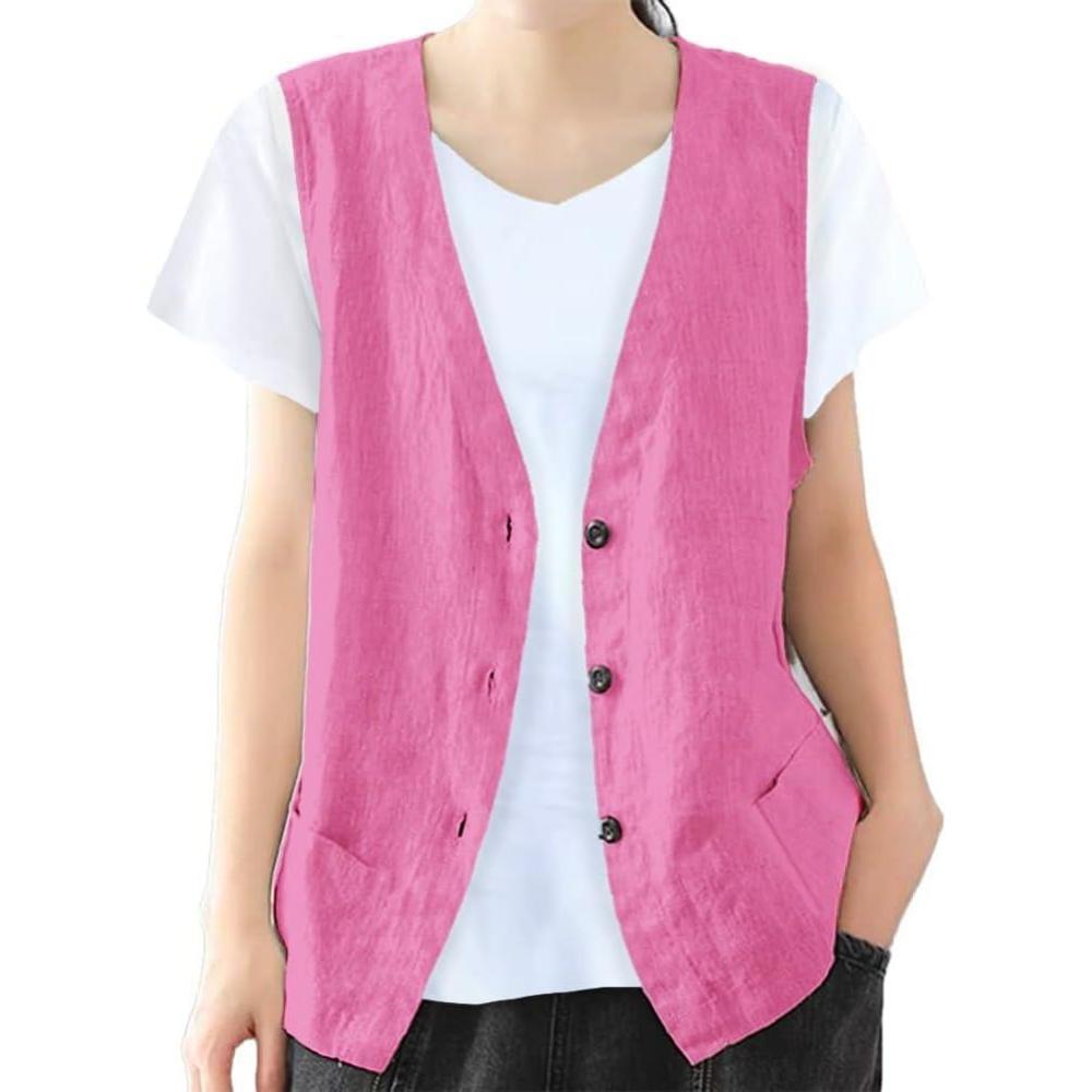 IDEALSANXUN Womens Cotton Linen Vest Casual Sleeveless Blazer Cardigans Lightweight Jacket Waistcoat(Rose)