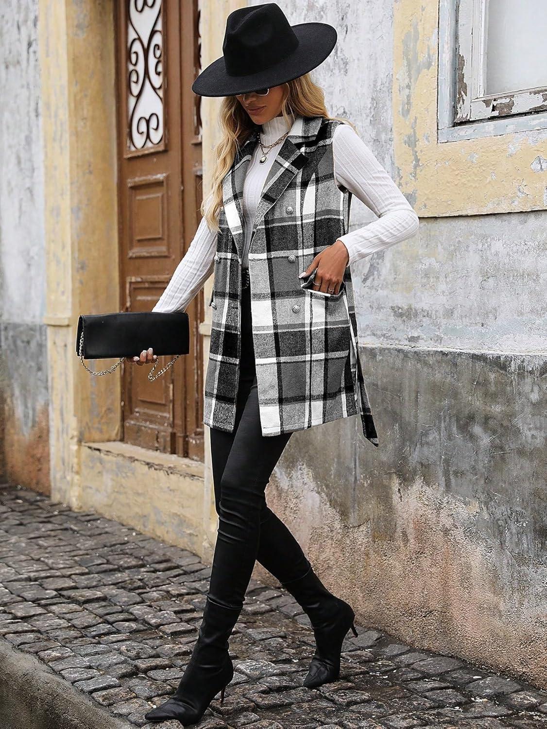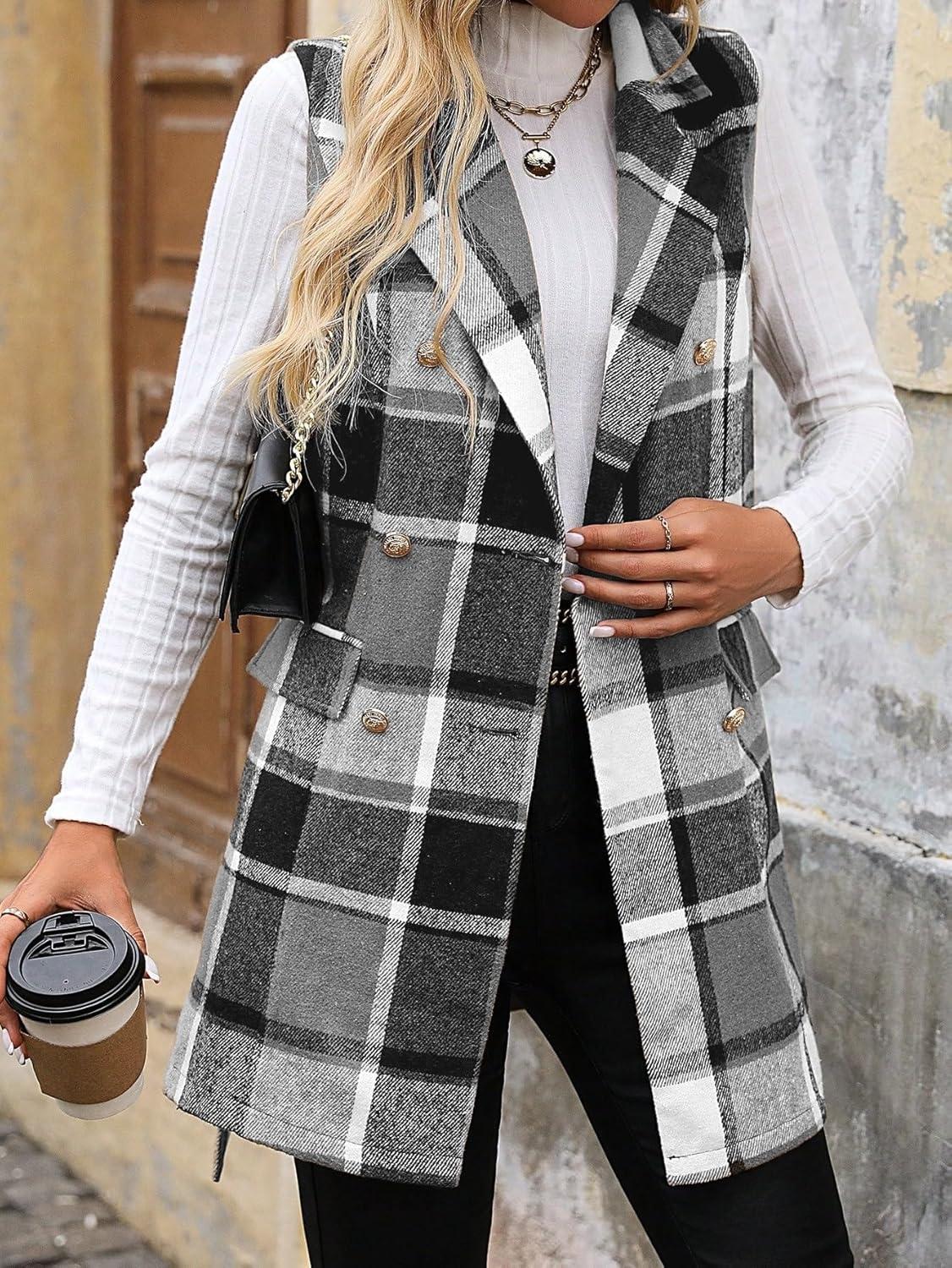 IDEALSANXUN Womens Double Breasted Plaid Vest Tops Fall Winter Sleeveless Blazer Jackets(Grey)