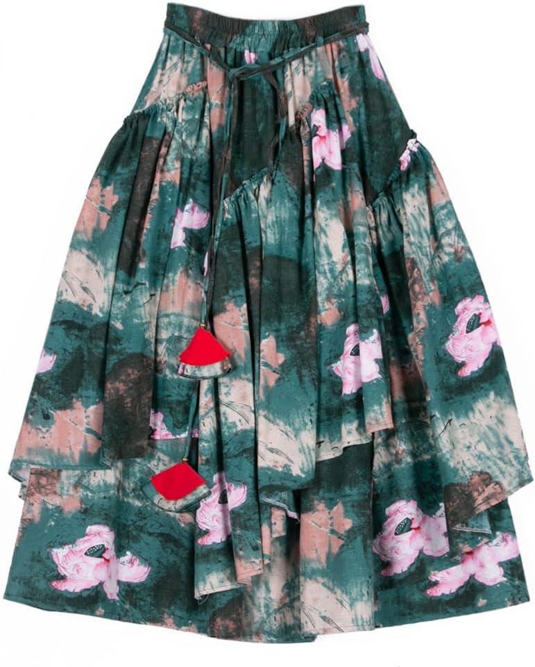 IDEALSANXUN Womens Elastic Waist Aline Cotton Lined Retro Maxi Hem Pleated Long Skirts(Print 001)