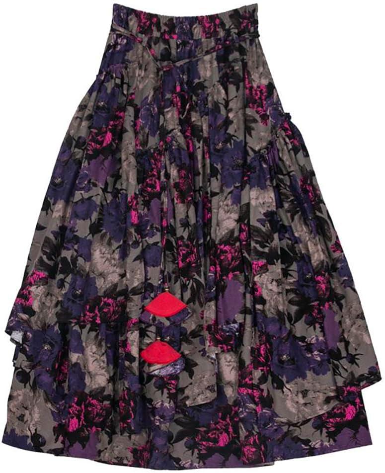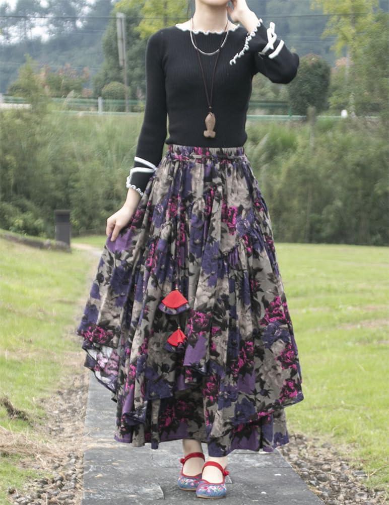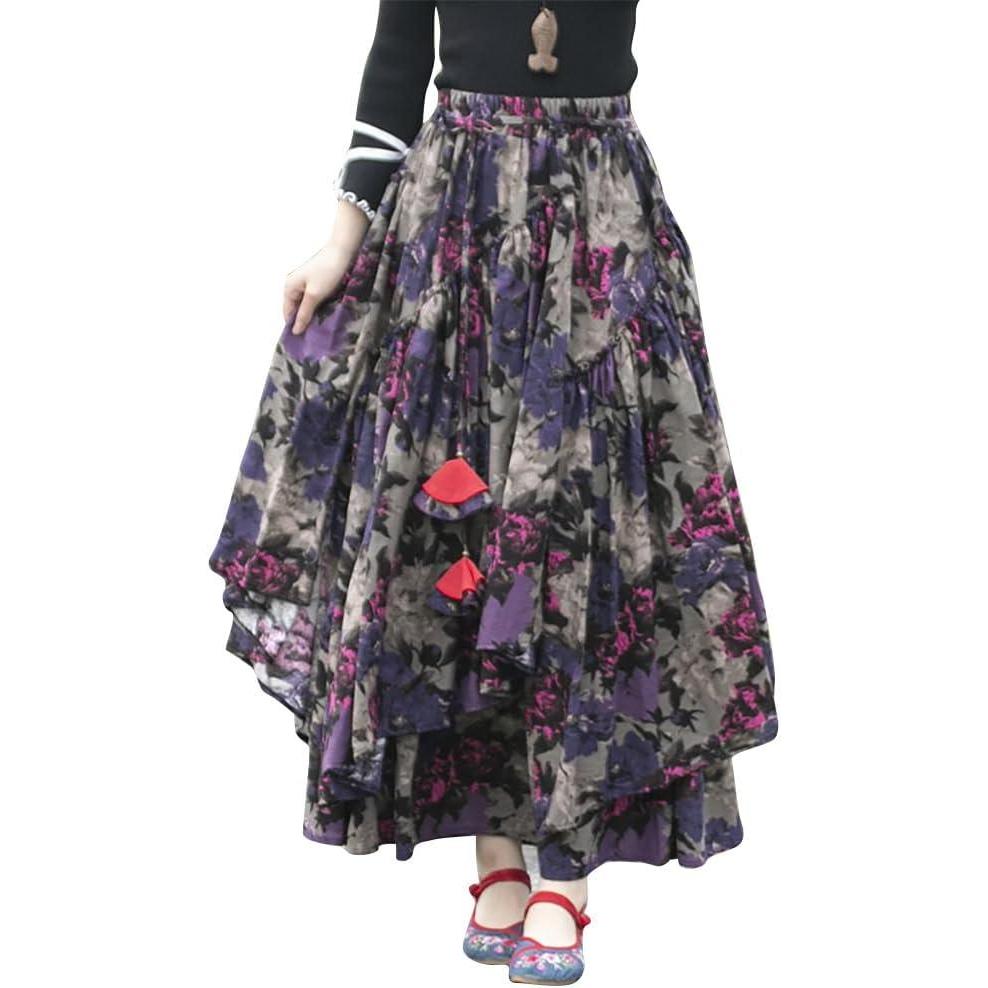 IDEALSANXUN Womens Elastic Waist Aline Cotton Lined Retro Maxi Hem Pleated Long Skirts(Print 616)