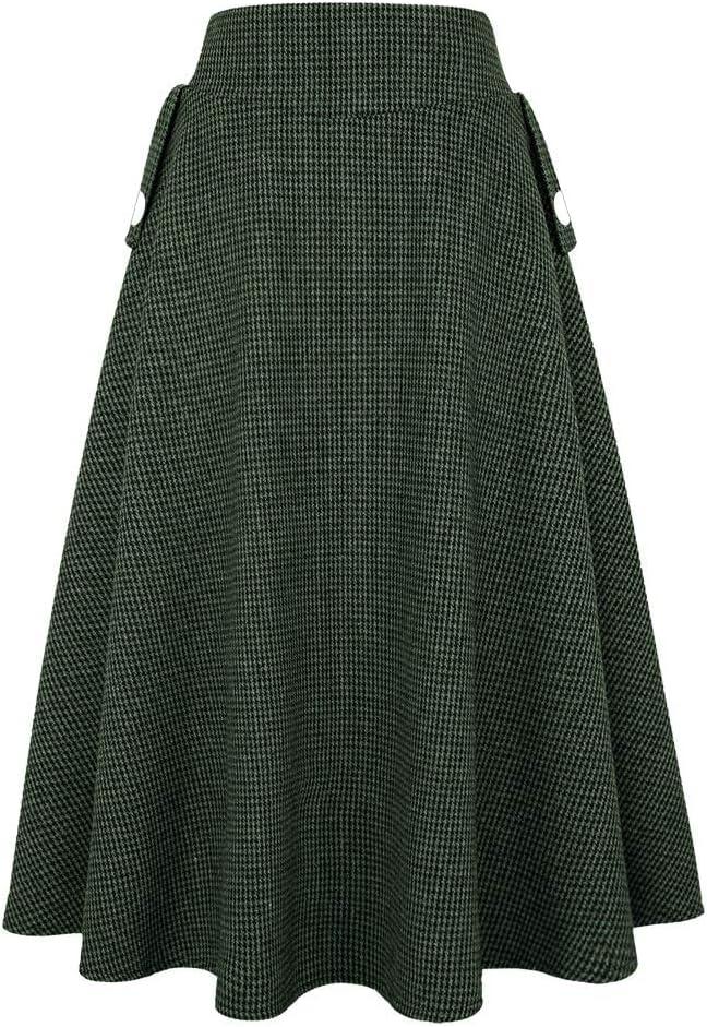 IDEALSANXUN Women’s Fall Winter High Waisted Wool Plaid A-line Long Skirt(Army)