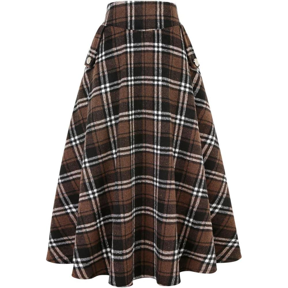 IDEALSANXUN Women’s Fall Winter High Waisted Wool Plaid A-line Long Skirt(Plaid Coffee)