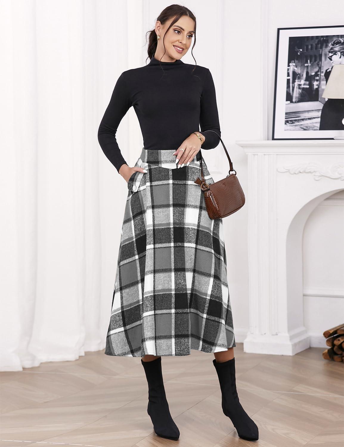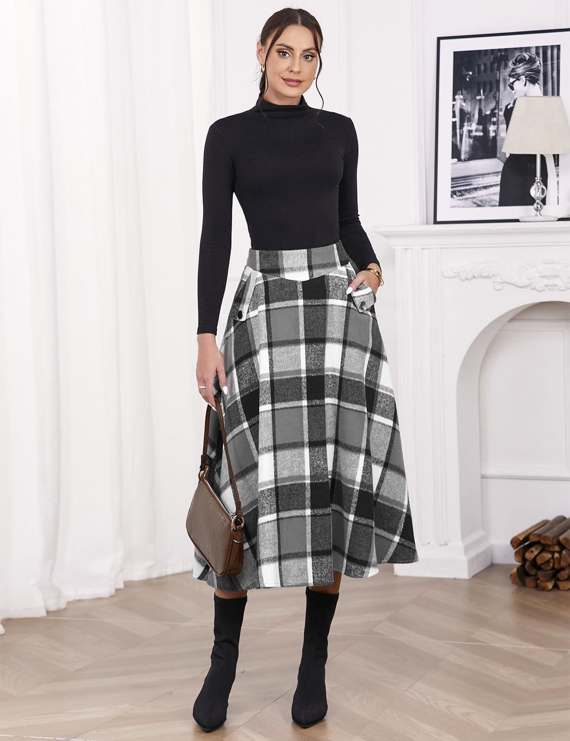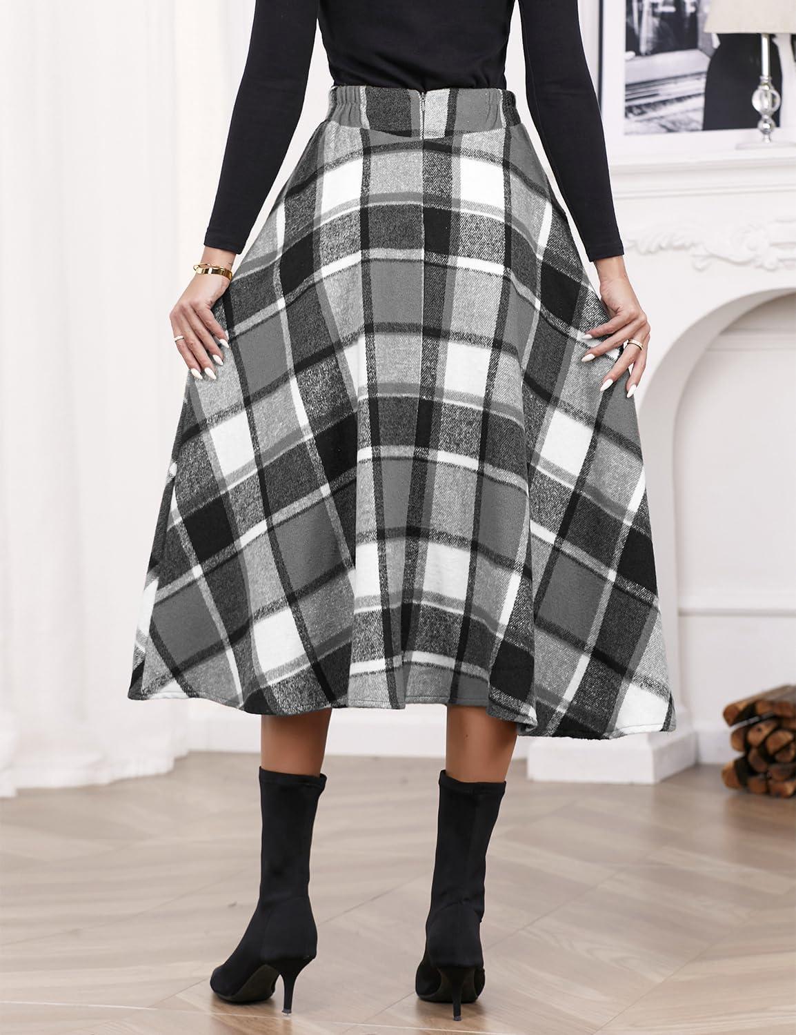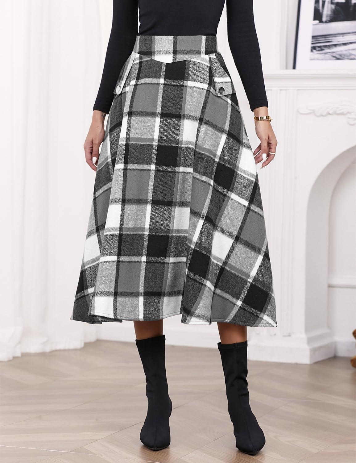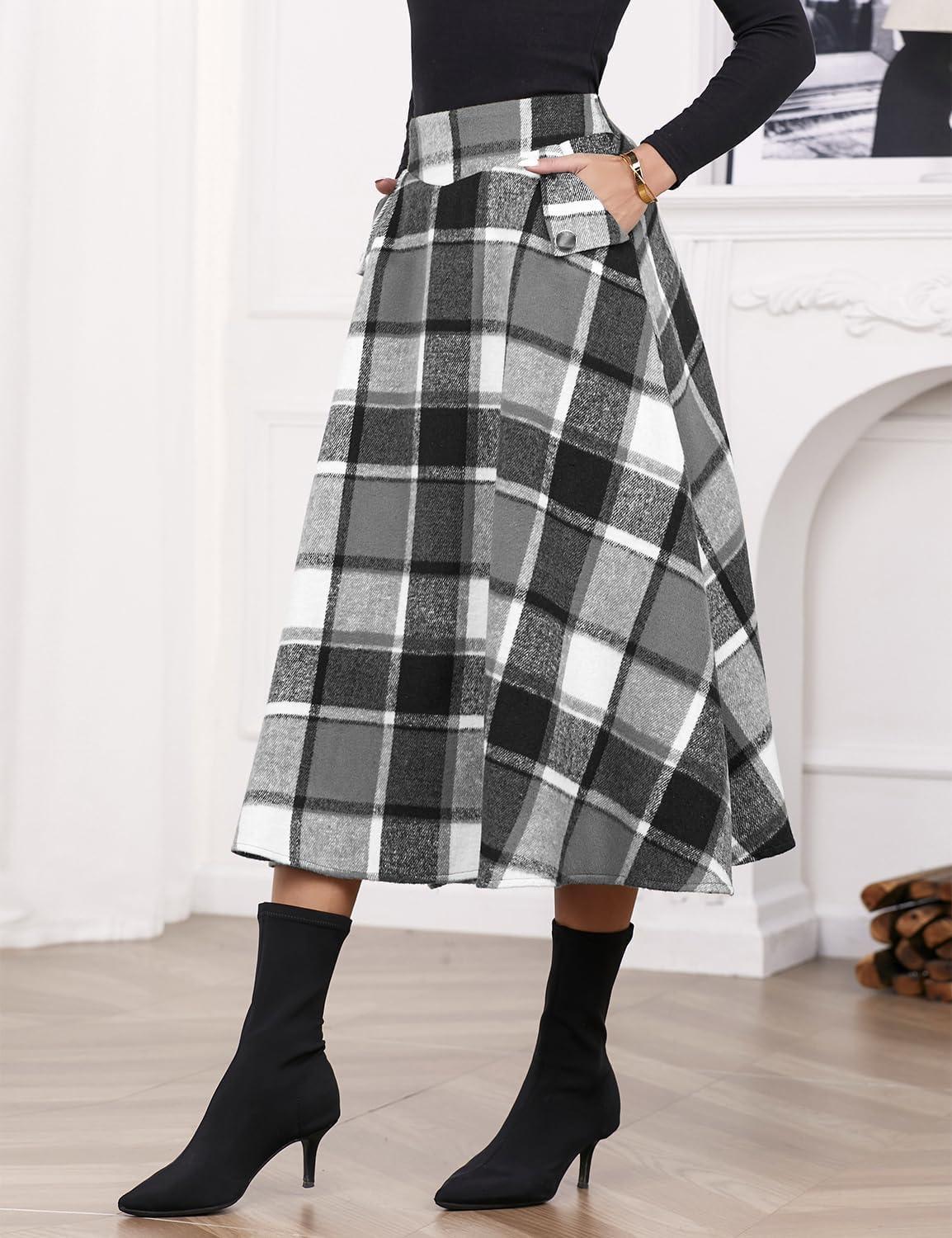 IDEALSANXUN Women’s Fall Winter High Waisted Wool Plaid A-line Long Skirt(Plaid Grey New)