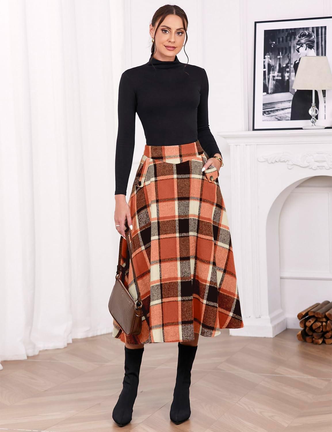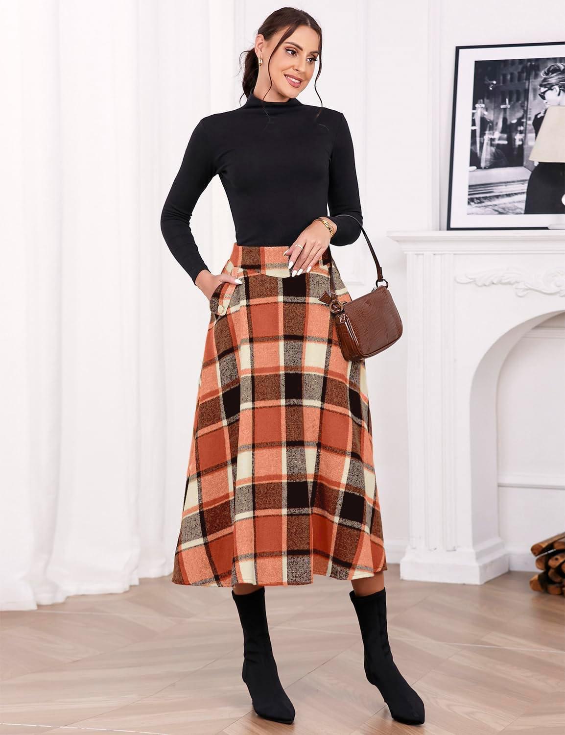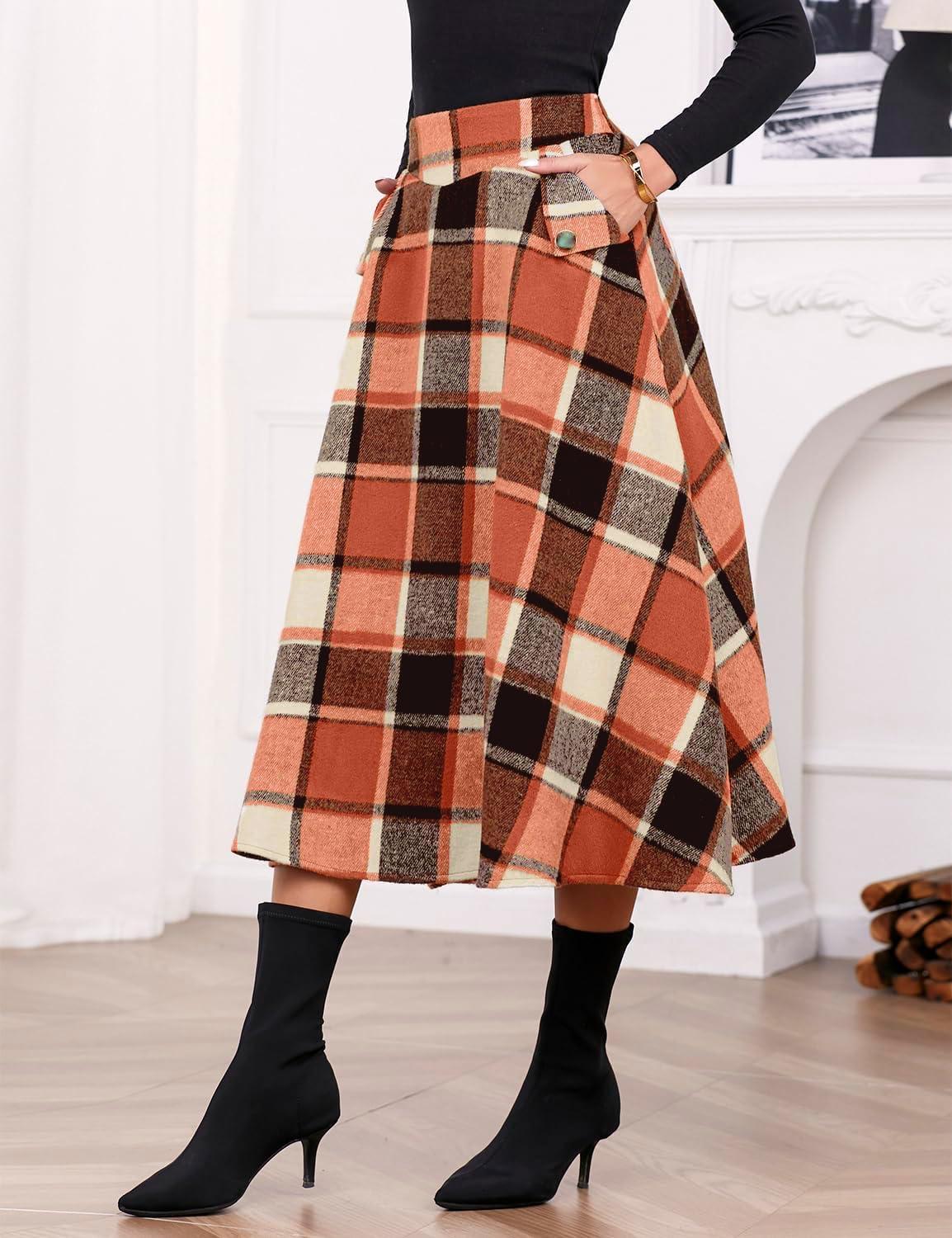 IDEALSANXUN Women’s Fall Winter High Waisted Wool Plaid A-line Long Skirt(Plaid Orange New)