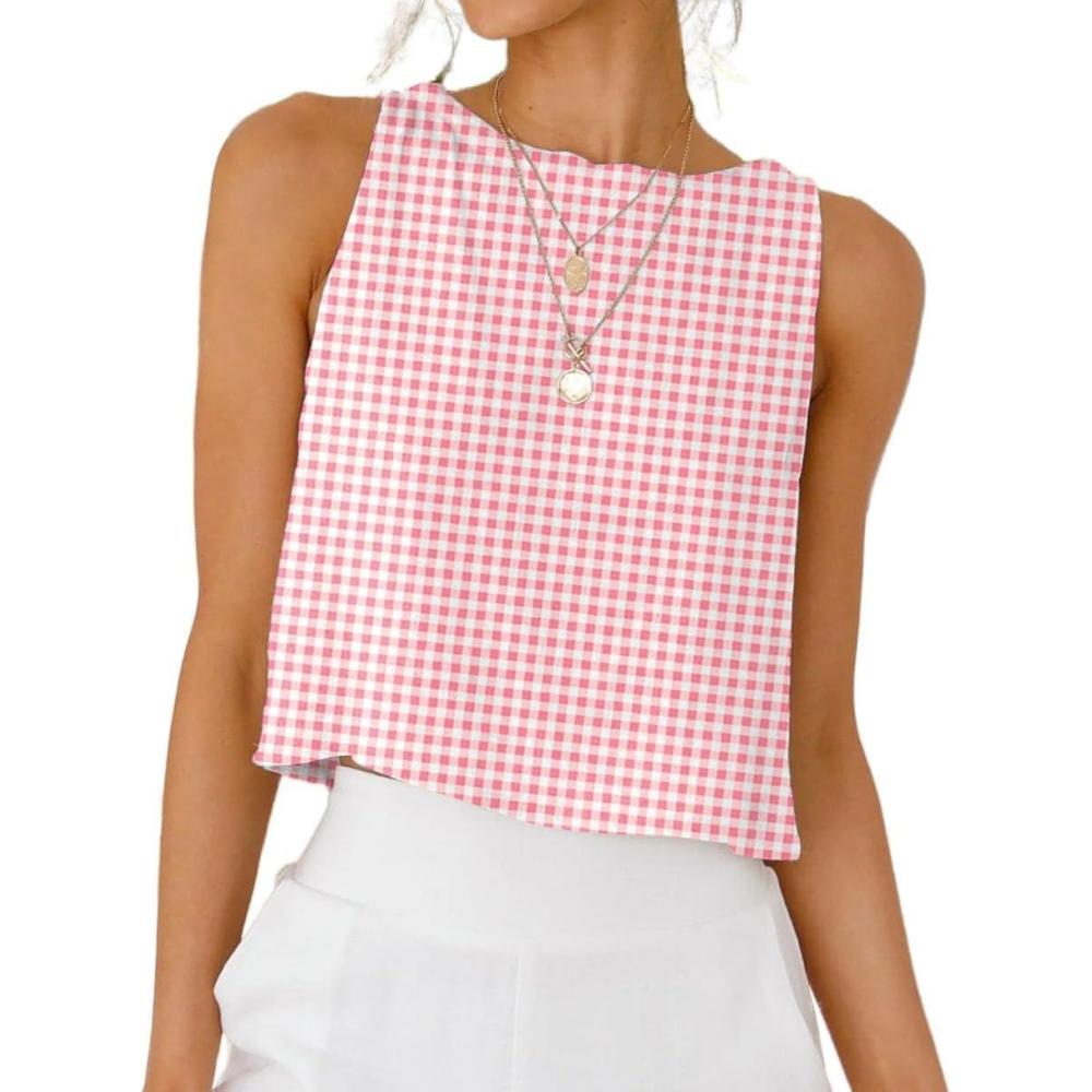IDEALSANXUN Womens Gingham Tank Tops Spring Summer Casual Crop Cotton Sleeveless Shirts Blouses(Z Pink)