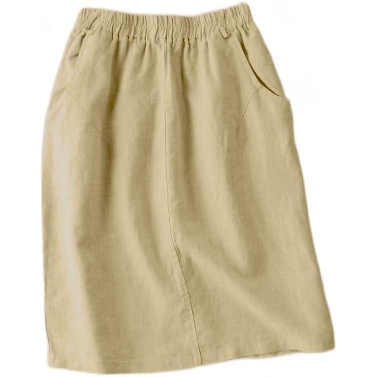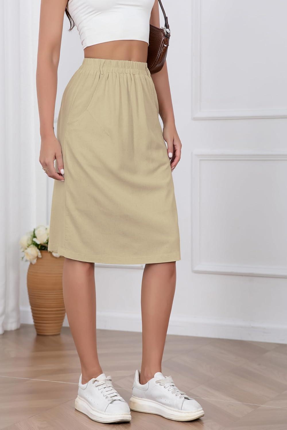 IDEALSANXUN Womens Linen Skirt Spring Summer High Elastic Waist Midi Skirt with Pockets(Khaki)
