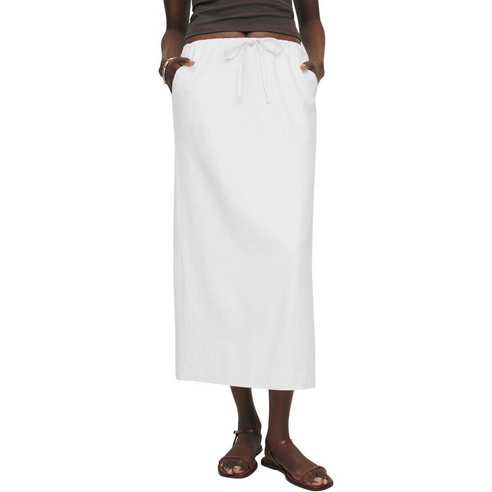 IDEALSANXUN Womens Linen Skirts Trendy Elastic Waist Drawstring Long Skirts with Slit(White)