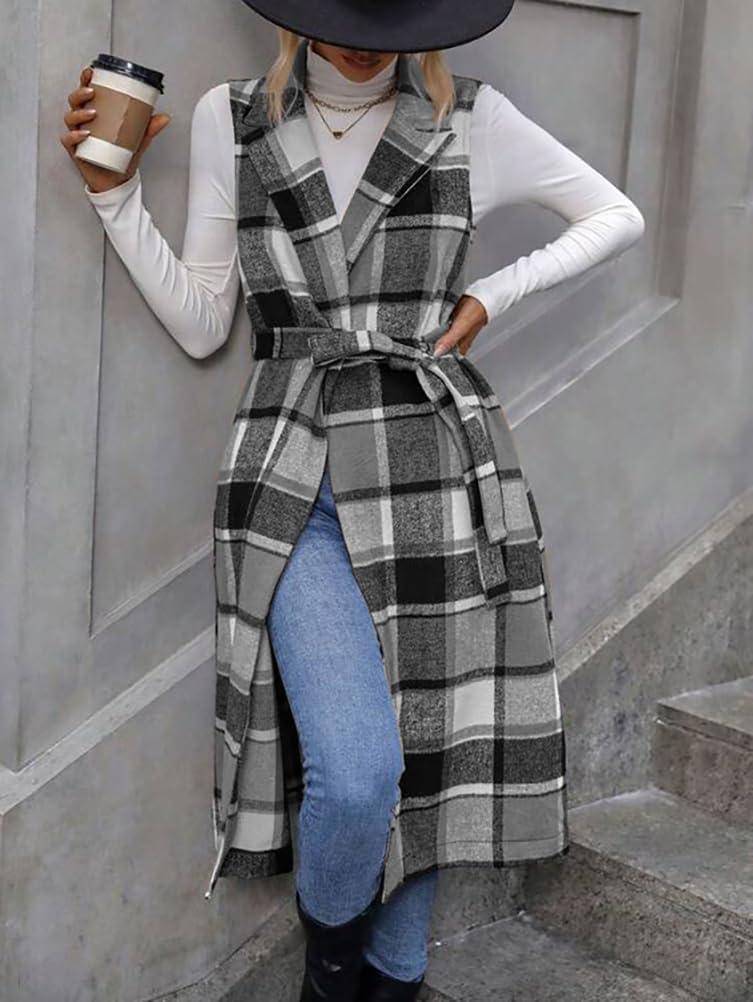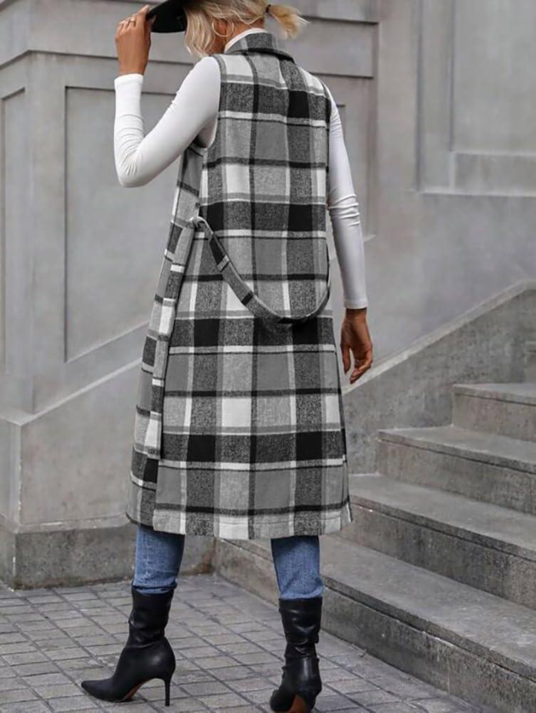 IDEALSANXUN Womens Long Plaid Vest Fall Winter Sleeveless Blazer Jackets Open Front Cardigan(Grey)