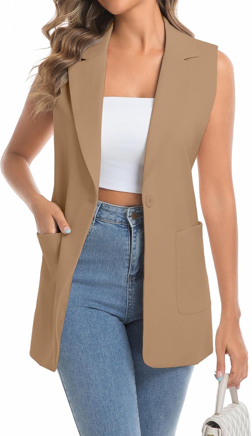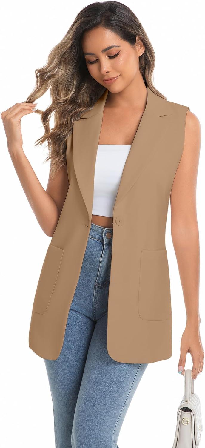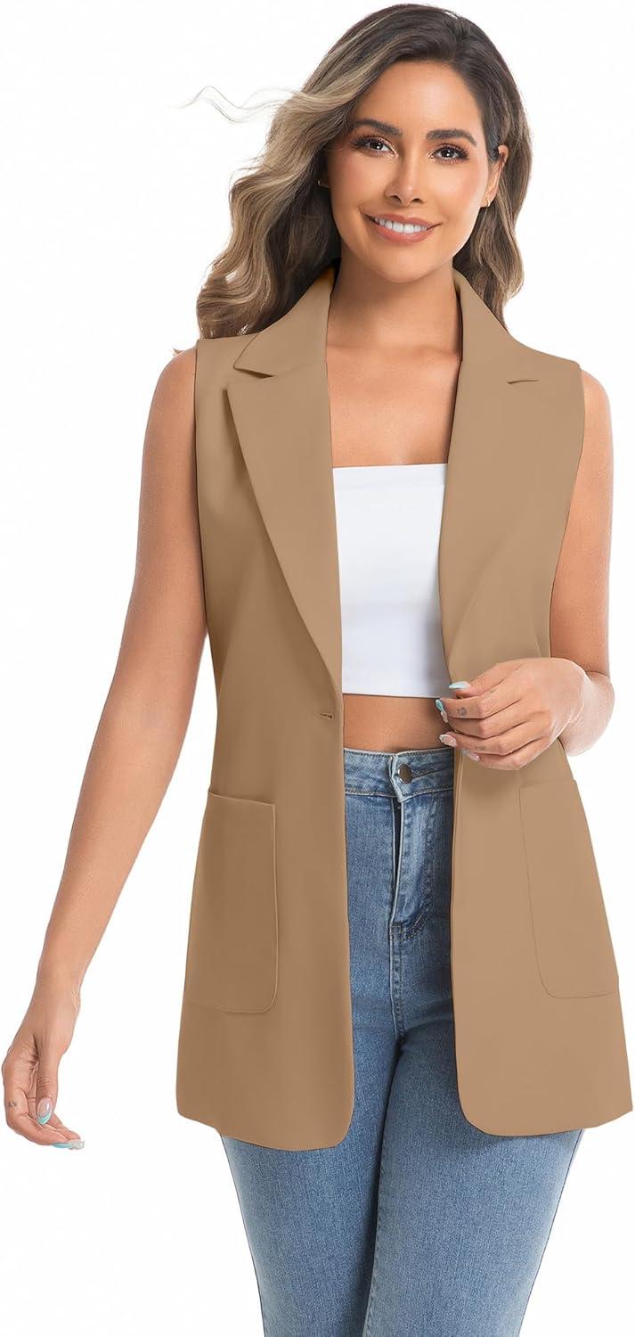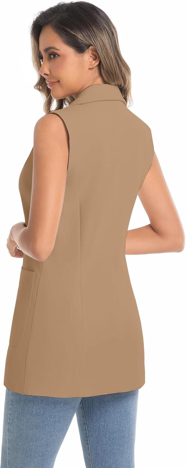 IDEALSANXUN Womens Long Vest Sleeveless Blazer Dressy Spring Summer Suit Jackets(Khaki)