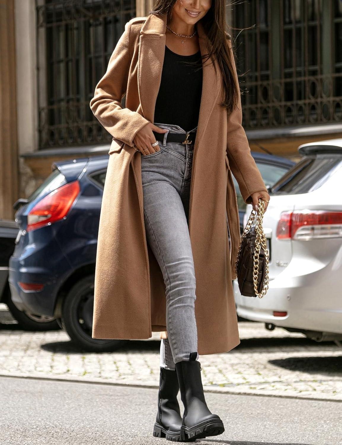 IDEALSANXUN Womens Long Wool Coats Fall Winter Open Front Trench Coat Peacoat with Self Belt(Camel)