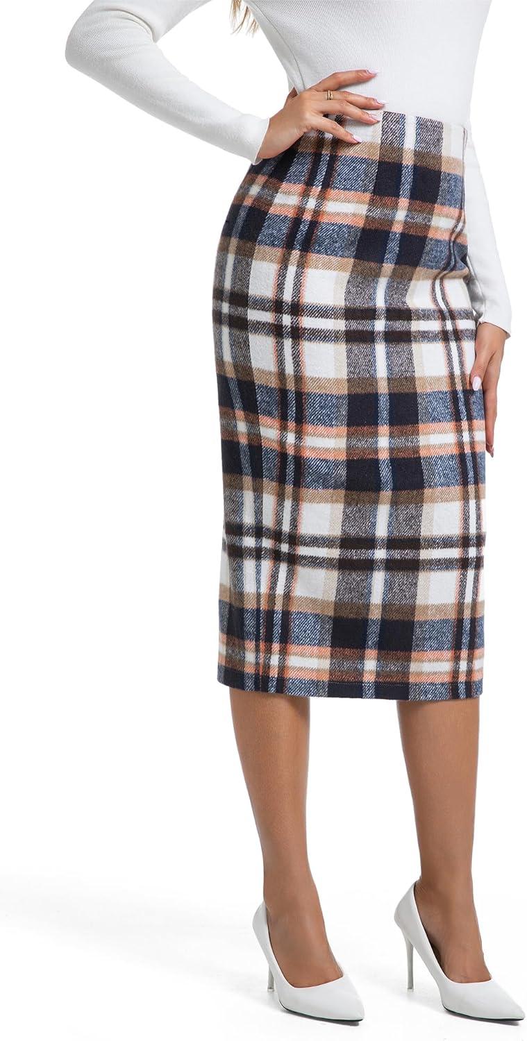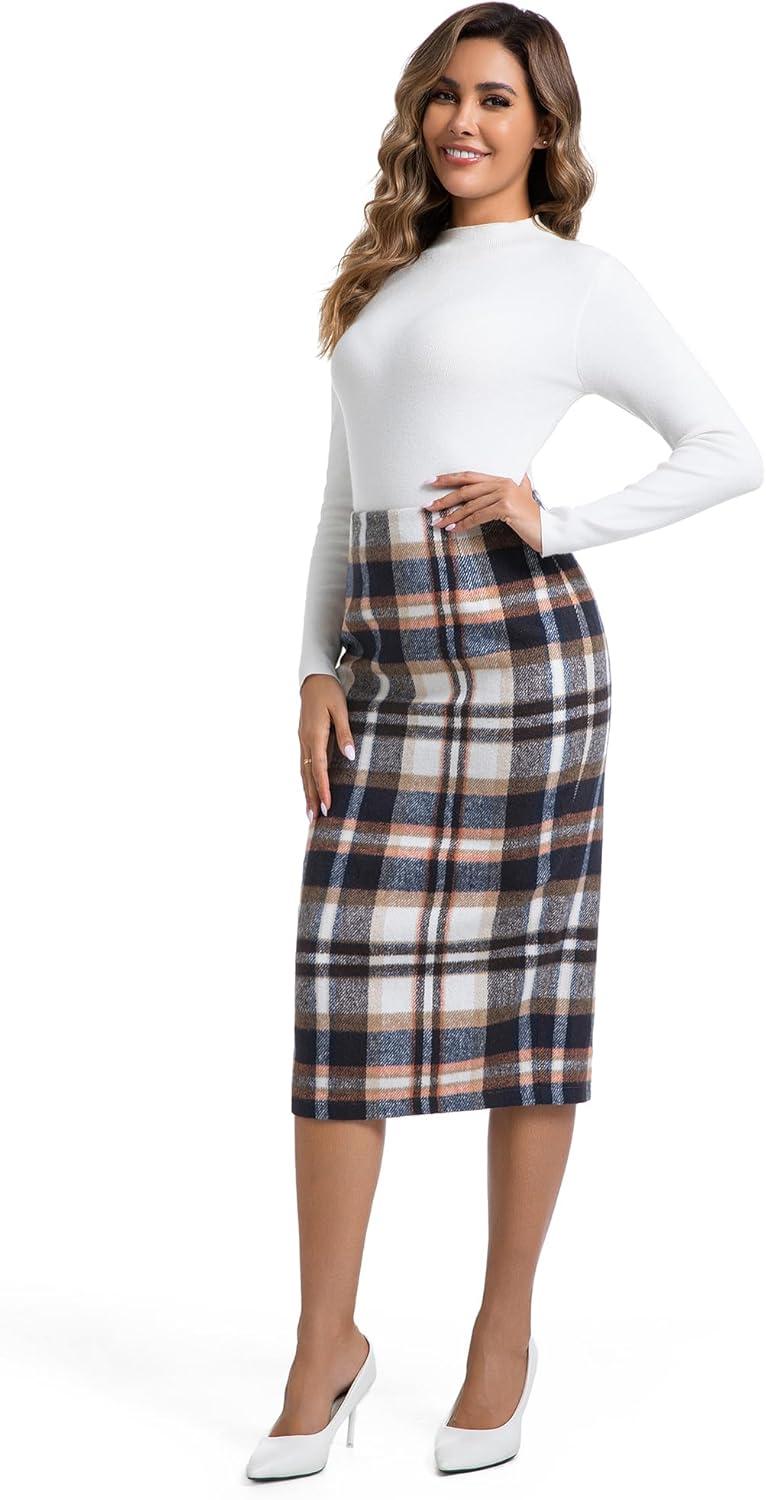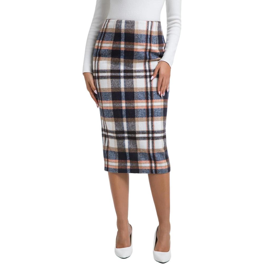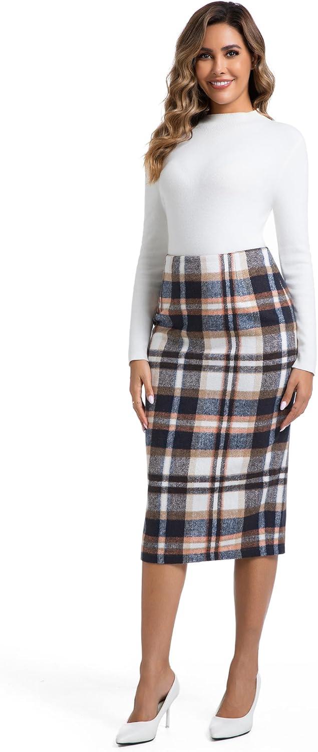 IDEALSANXUN Womens Midi Plaid Skirt Fall Winter High Waisted Pencil Skirt with Back Slit(Brown New)