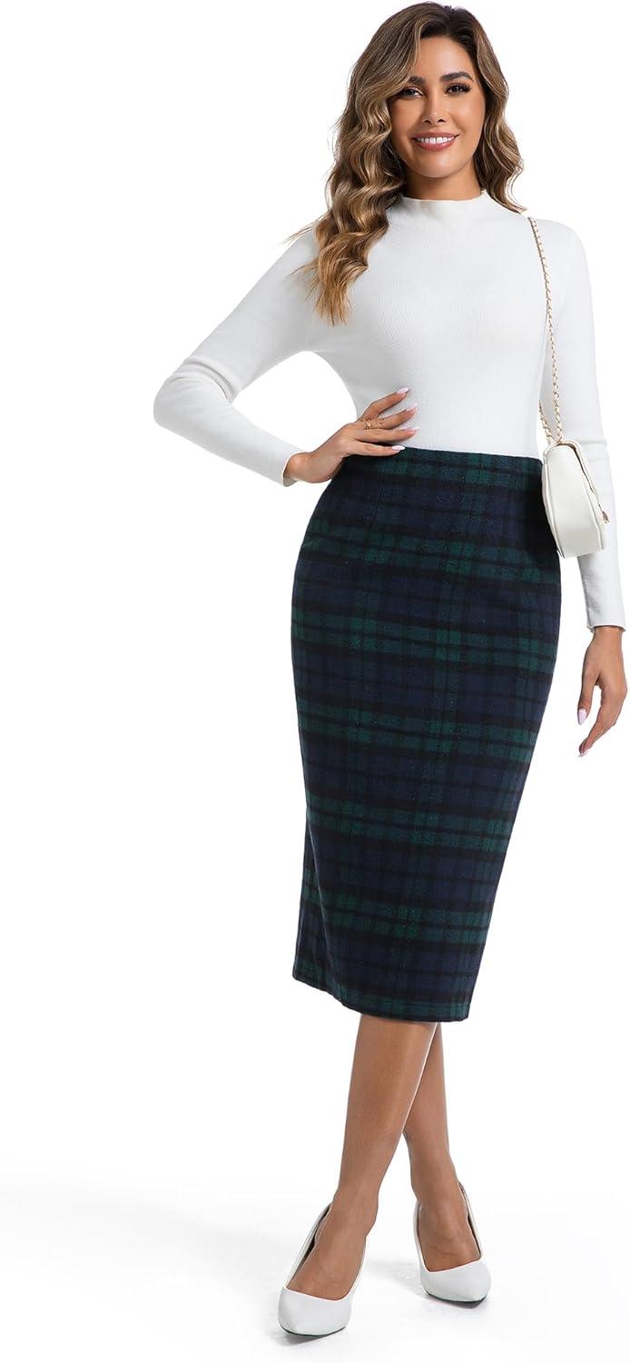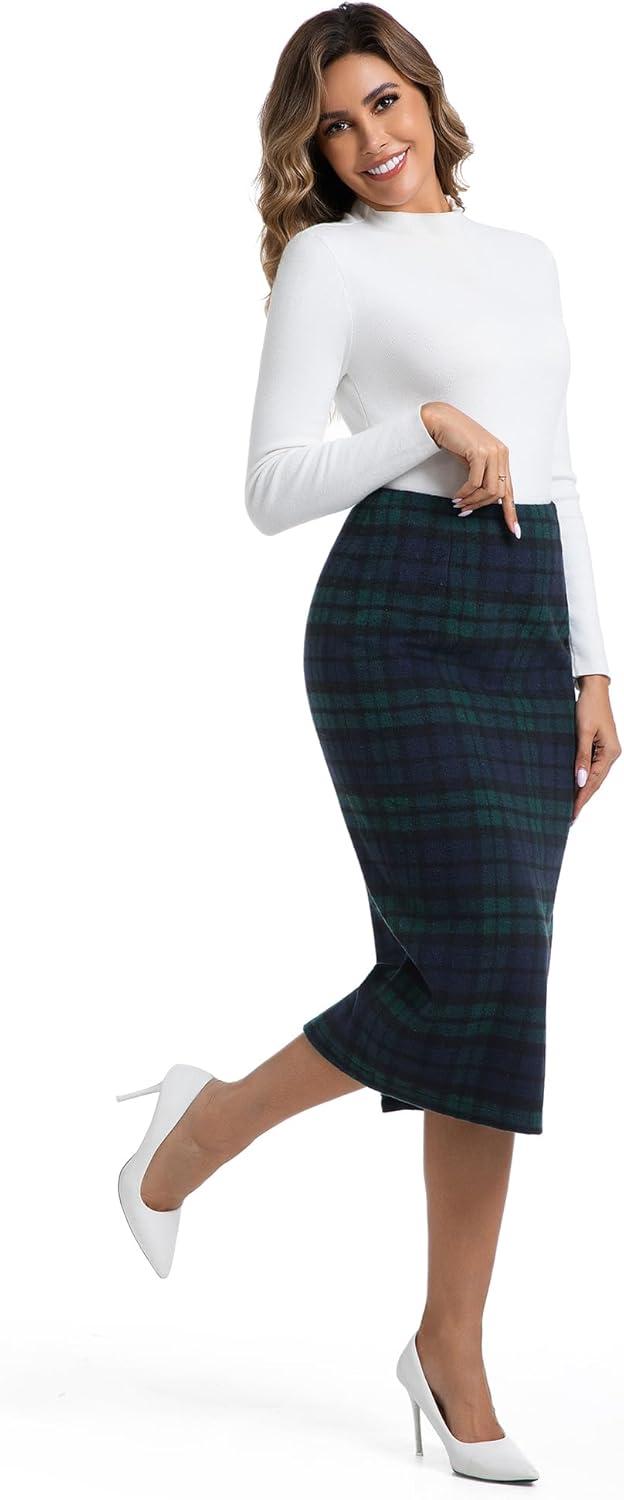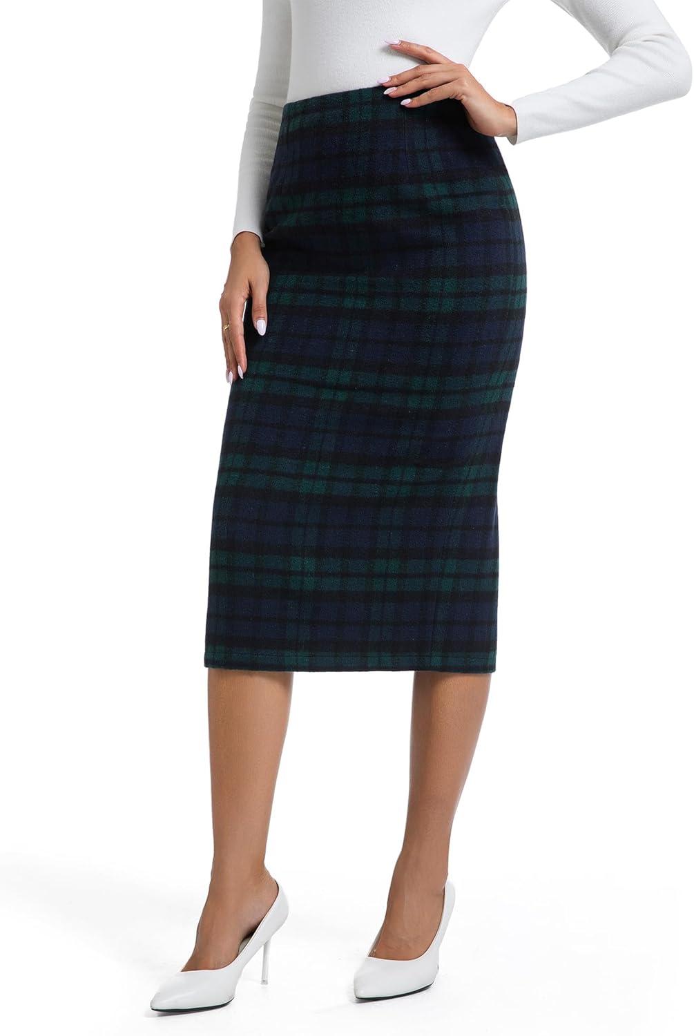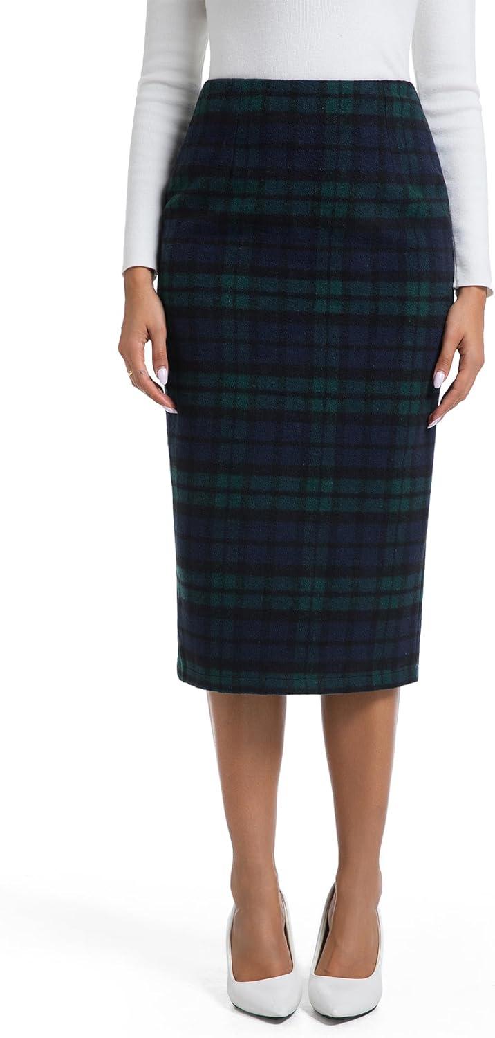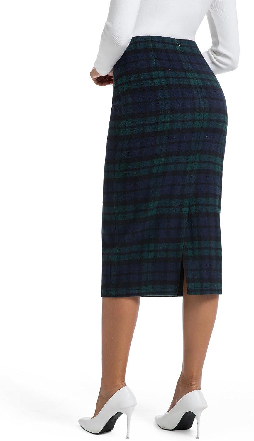 IDEALSANXUN Womens Midi Plaid Skirt Fall Winter High Waisted Pencil Skirt with Back Slit(Green)