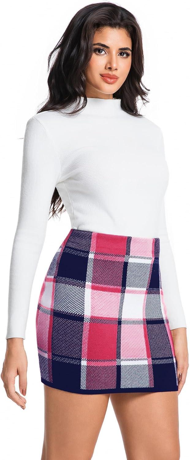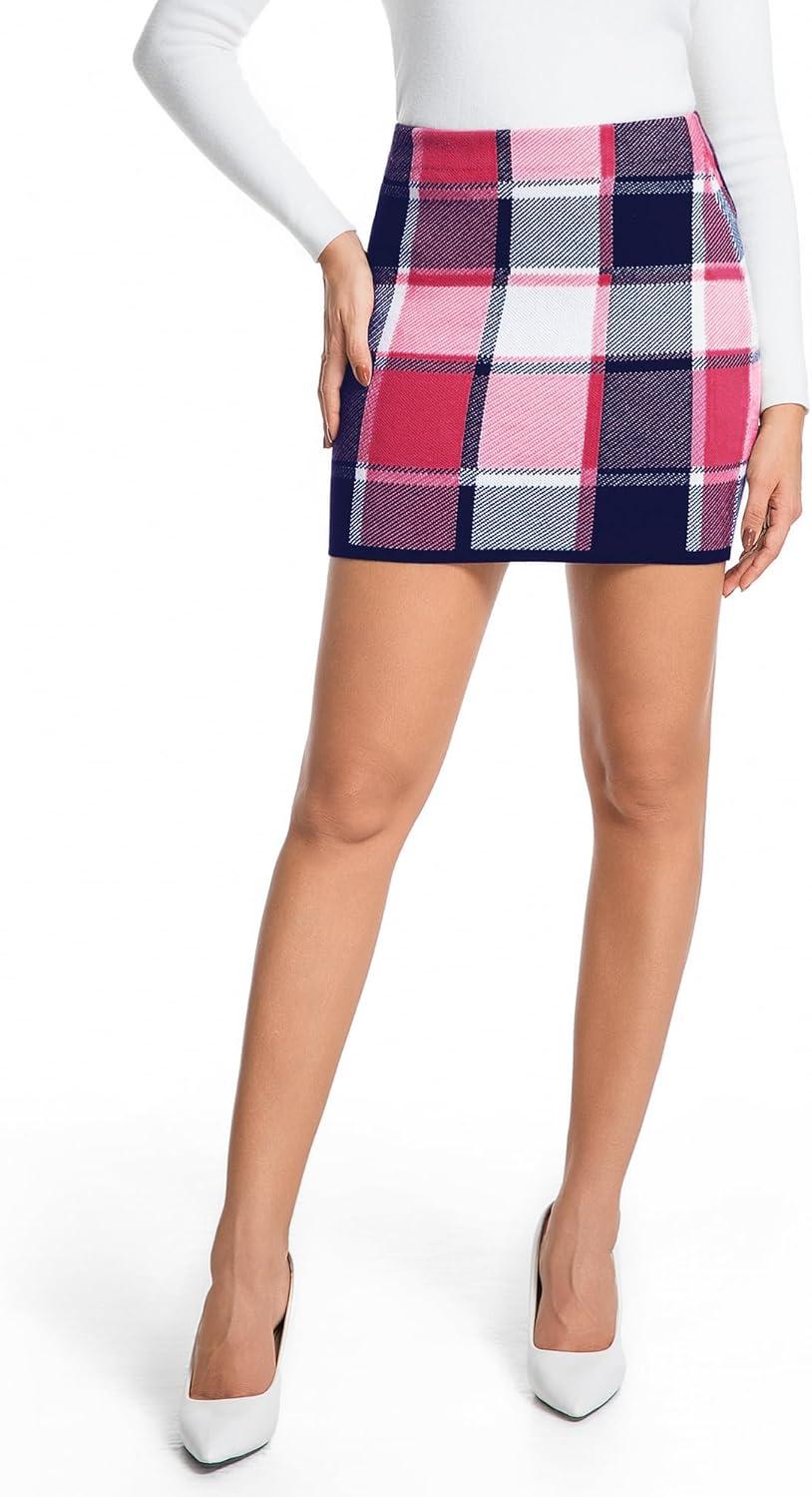 IDEALSANXUN Womens Plaid Mini Skirt Fall Winter High Elastic Waist Short Pencil Skirt(A Pink)