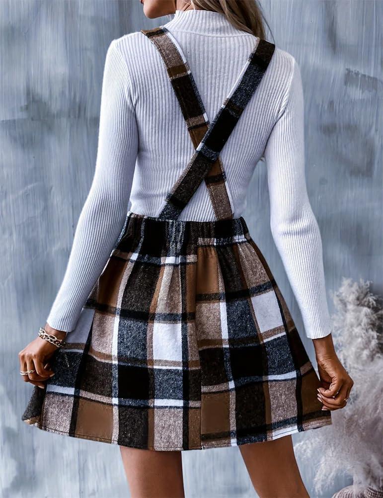 imageIDEALSANXUN Womens Plaid Overall Dress Fall Winter A Line Pleated Mini DressesBrown New