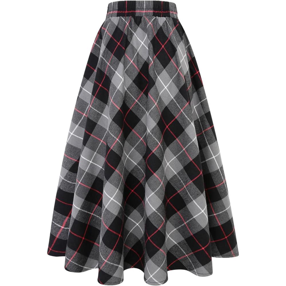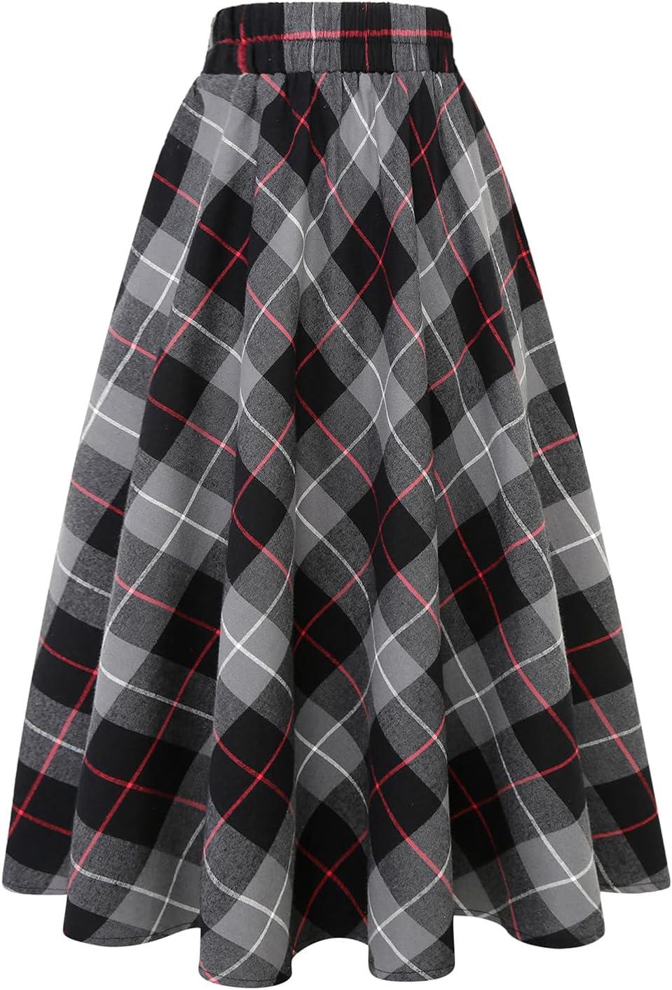 IDEALSANXUN Women’s Plaid Skirt Elastic Waist A-line Midi Pleated Skirts(Dark Grey)