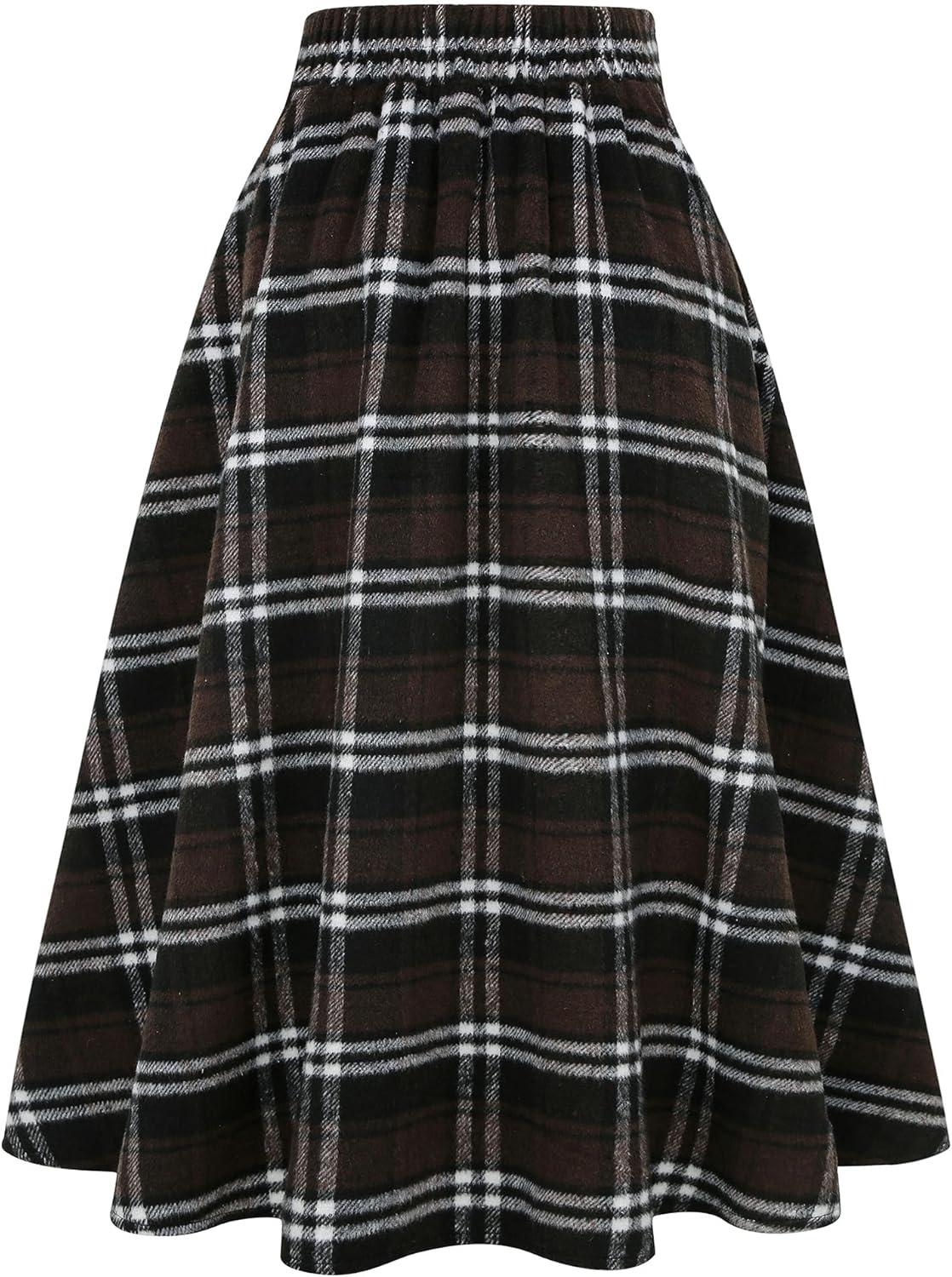 IDEALSANXUN Womens Plaid Skirts Fall Winter High Waisted Button Down A Line Pleated Midi Skirt with Pockets(Brown New)