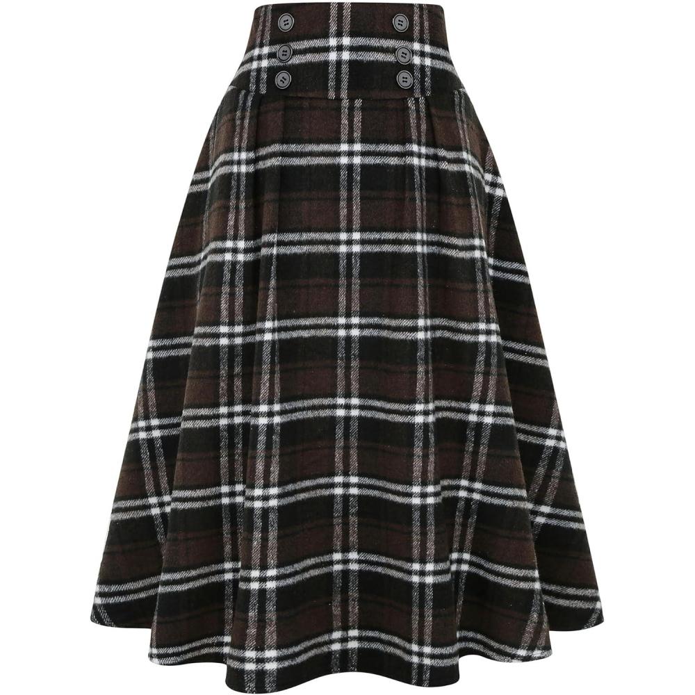 IDEALSANXUN Womens Plaid Skirts Fall Winter High Waisted Button Down A Line Pleated Midi Skirt with Pockets(Coffee)
