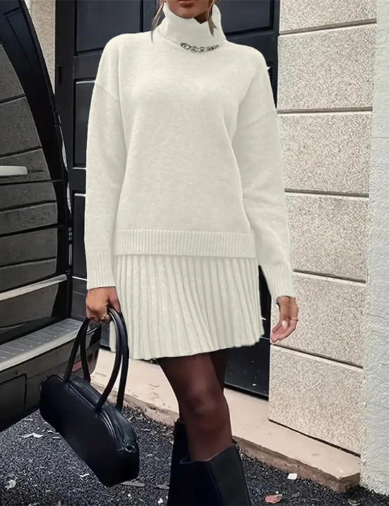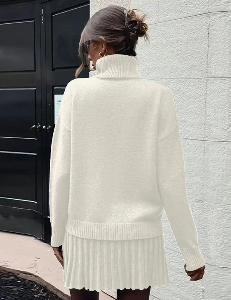 IDEALSANXUN Womens Sweater and Skirt Set Fall Winter 2 Piece Set Turtleneck Sweater Pleated Skirt(Beige)