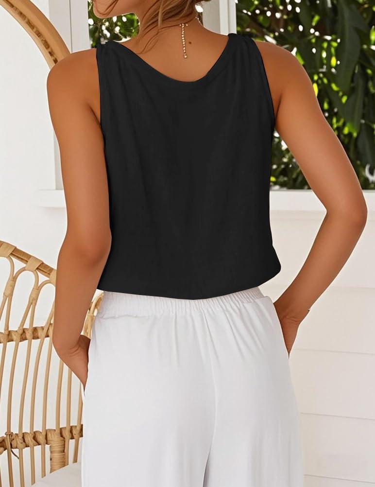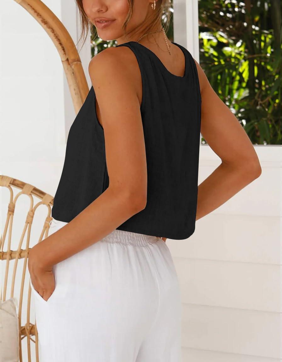 IDEALSANXUN Womens V Neck Cropped Linen Tank Tops Spring Summer Sleeveless Shirts(Black)