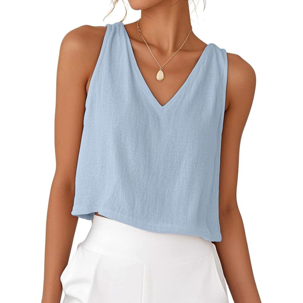 IDEALSANXUN Womens V Neck Cropped Linen Tank Tops Spring Summer Sleeveless Shirts(Light Blue)