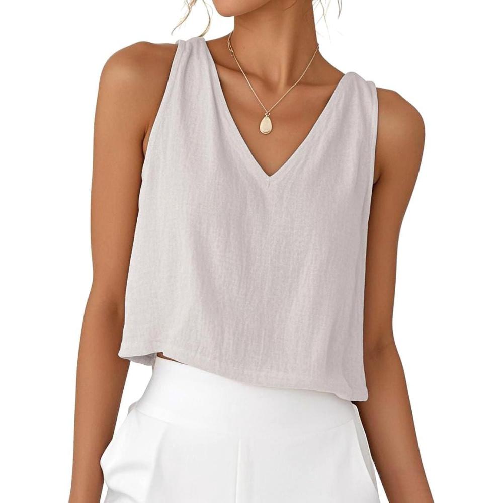 IDEALSANXUN Womens V Neck Cropped Linen Tank Tops Spring Summer Sleeveless Shirts(Light Grey)