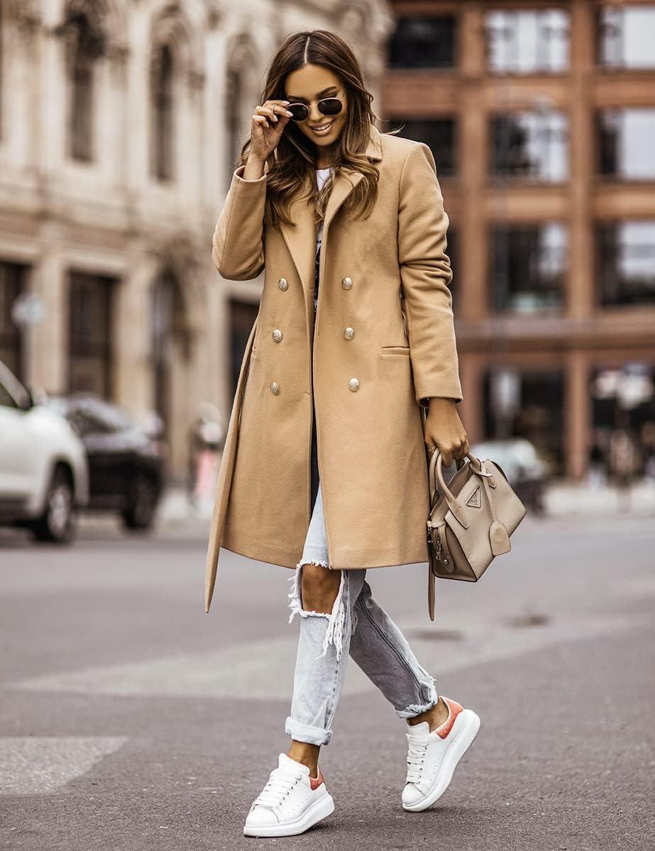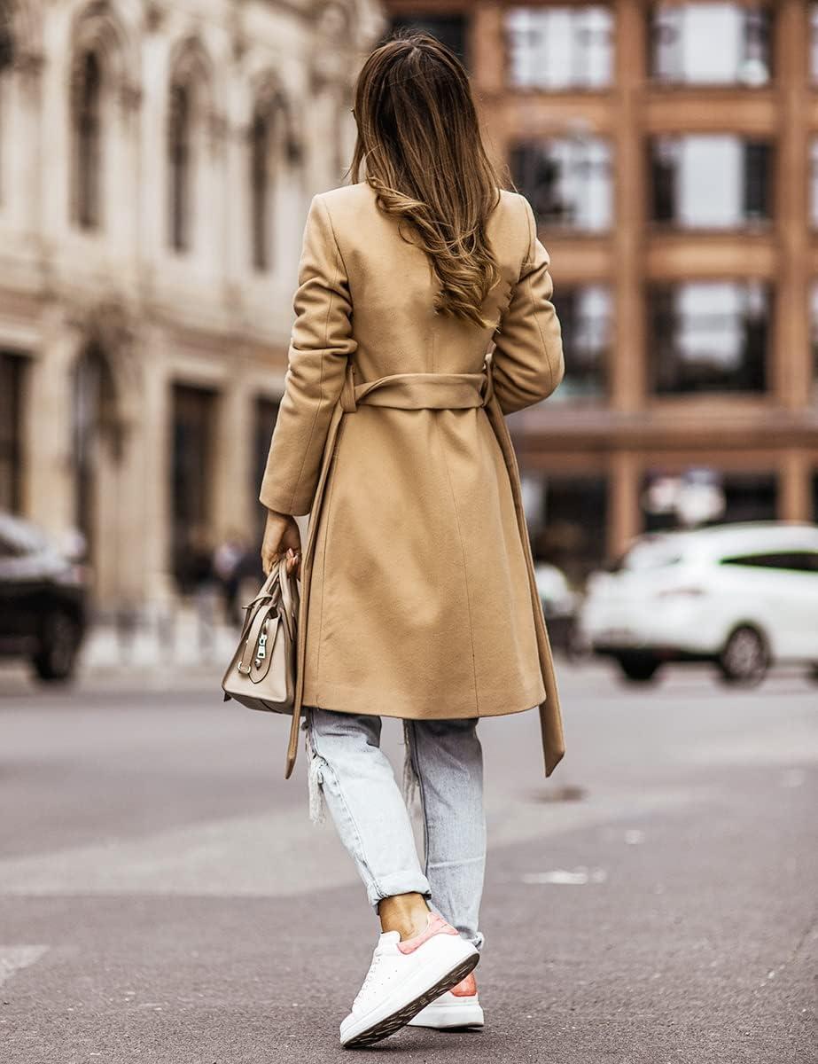 IDEALSANXUN Womens Wool Coats Fall Winter Double Breasted Trench Coat with Belt(Khaki)