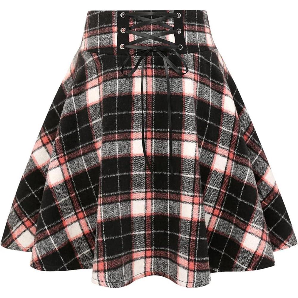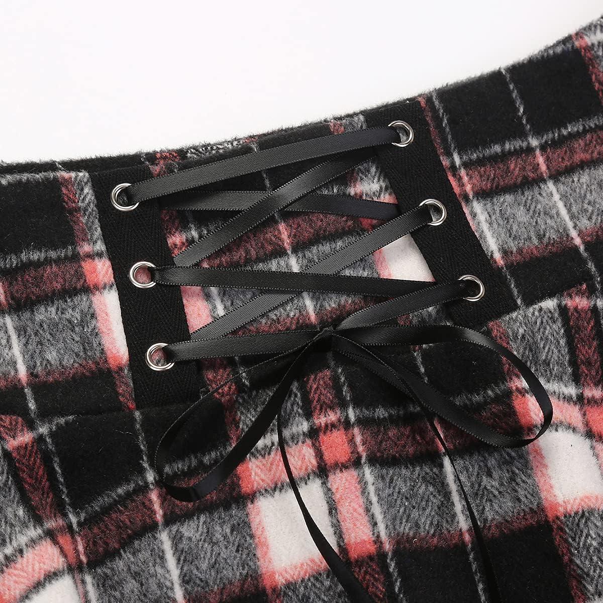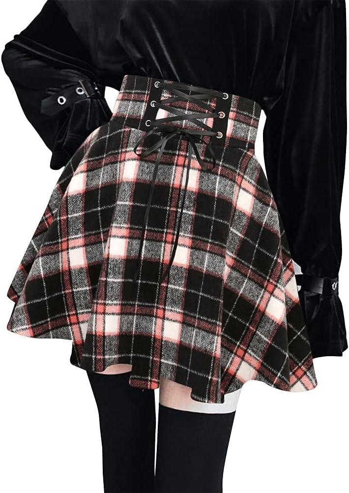 IDEALSANXUN Wool Plaid Mini Gothic Skirts for Womens High Waist Lace Up Short Pleated Skater Skirts(Pink&black)
