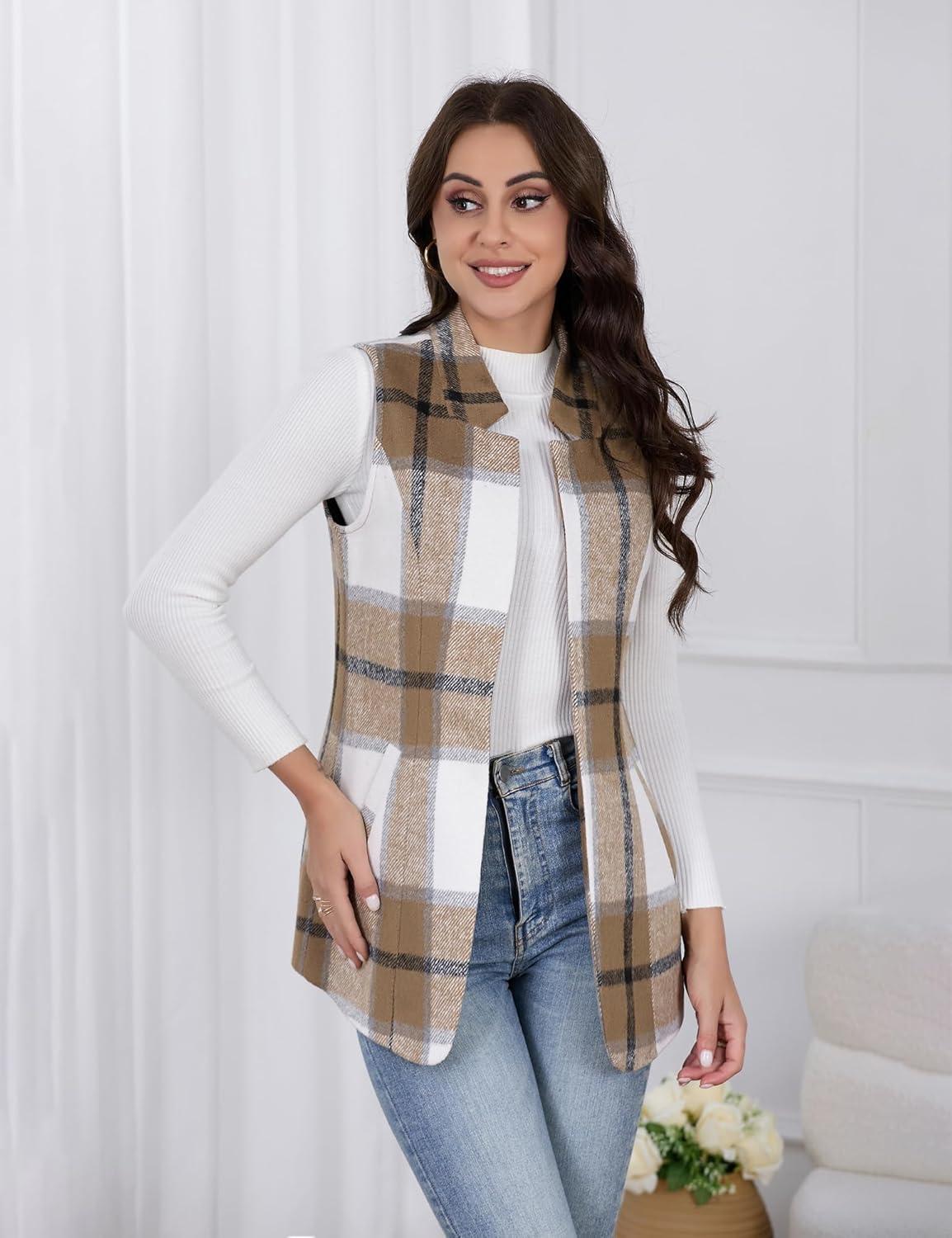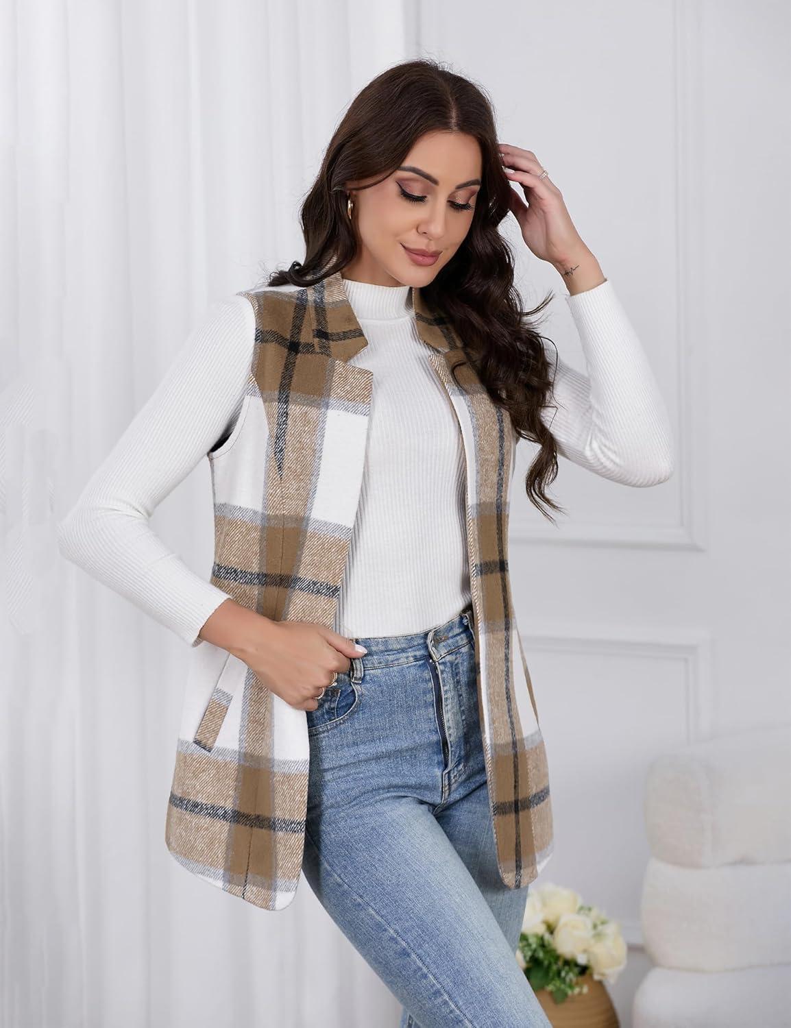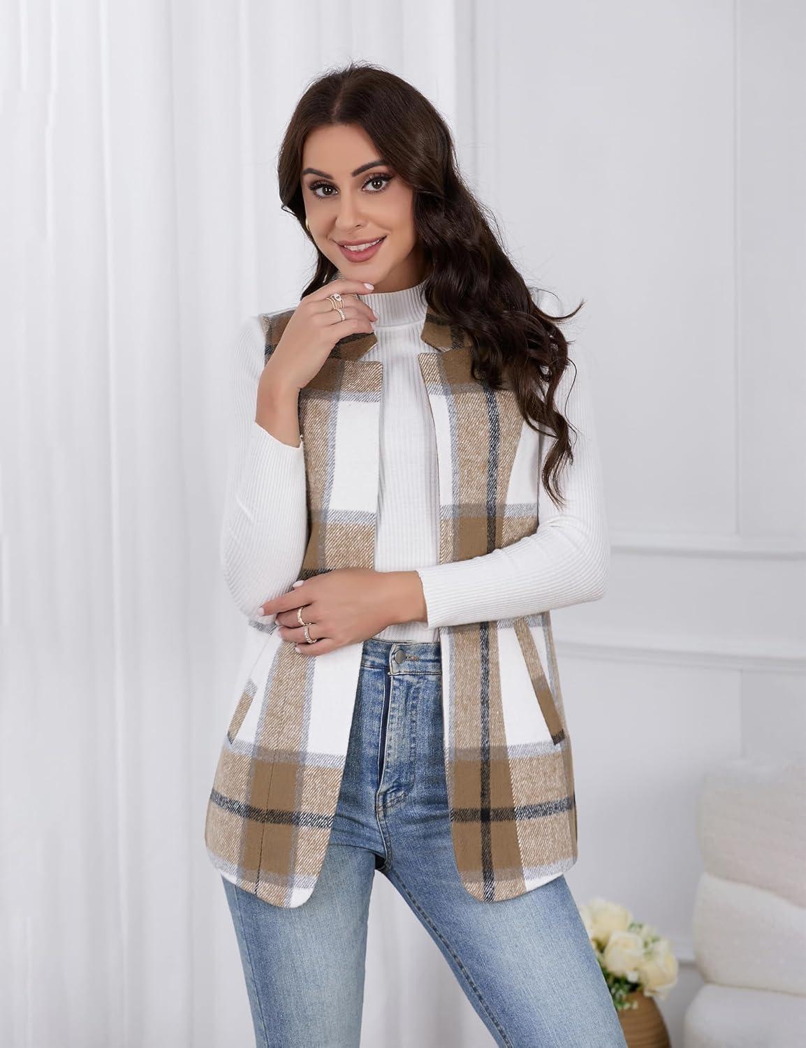IDEALSANXUN Wool Plaid Vest for Women Fall Winter Coat Sleeveless Blazer Jackets Casual Outwear Open Front Cardigan Top(Khaki)