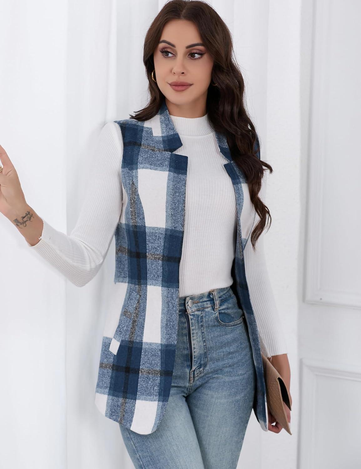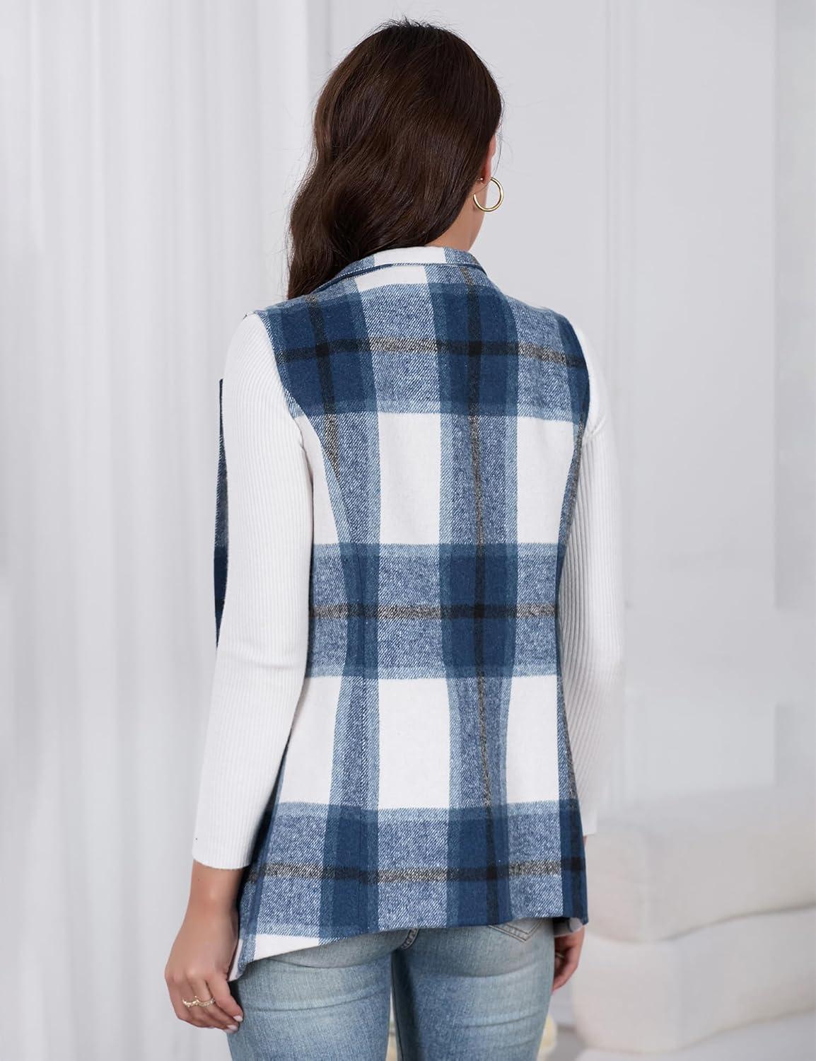 IDEALSANXUN Wool Plaid Vest for Women Fall Winter Coat Sleeveless Blazer Jackets Casual Outwear Open Front Cardigan Top(Navy)
