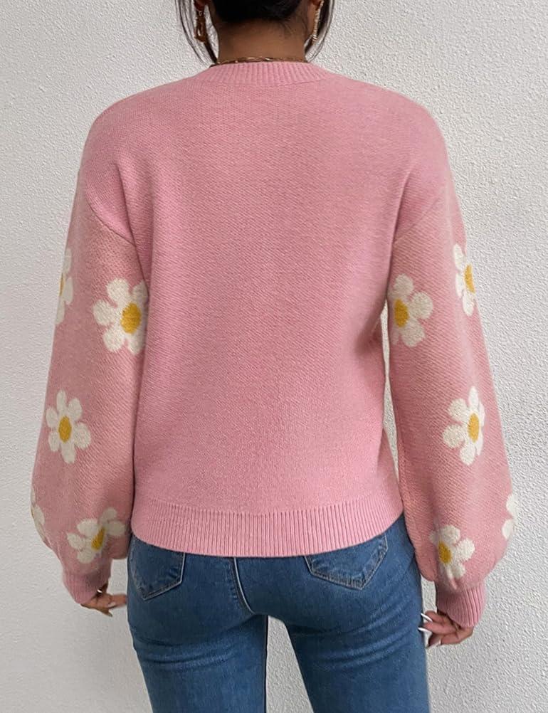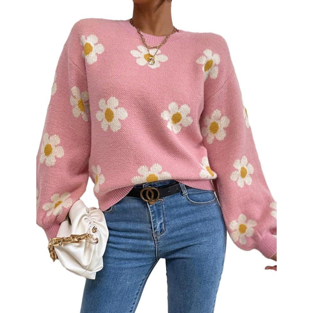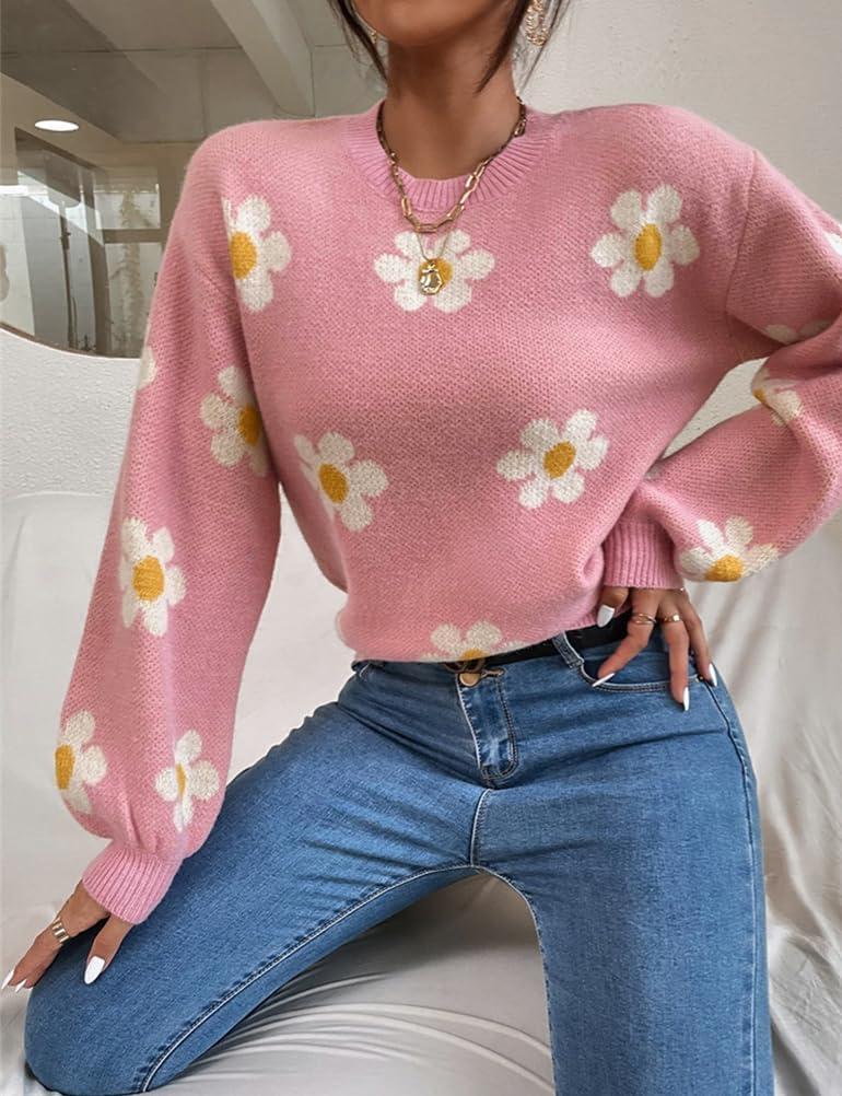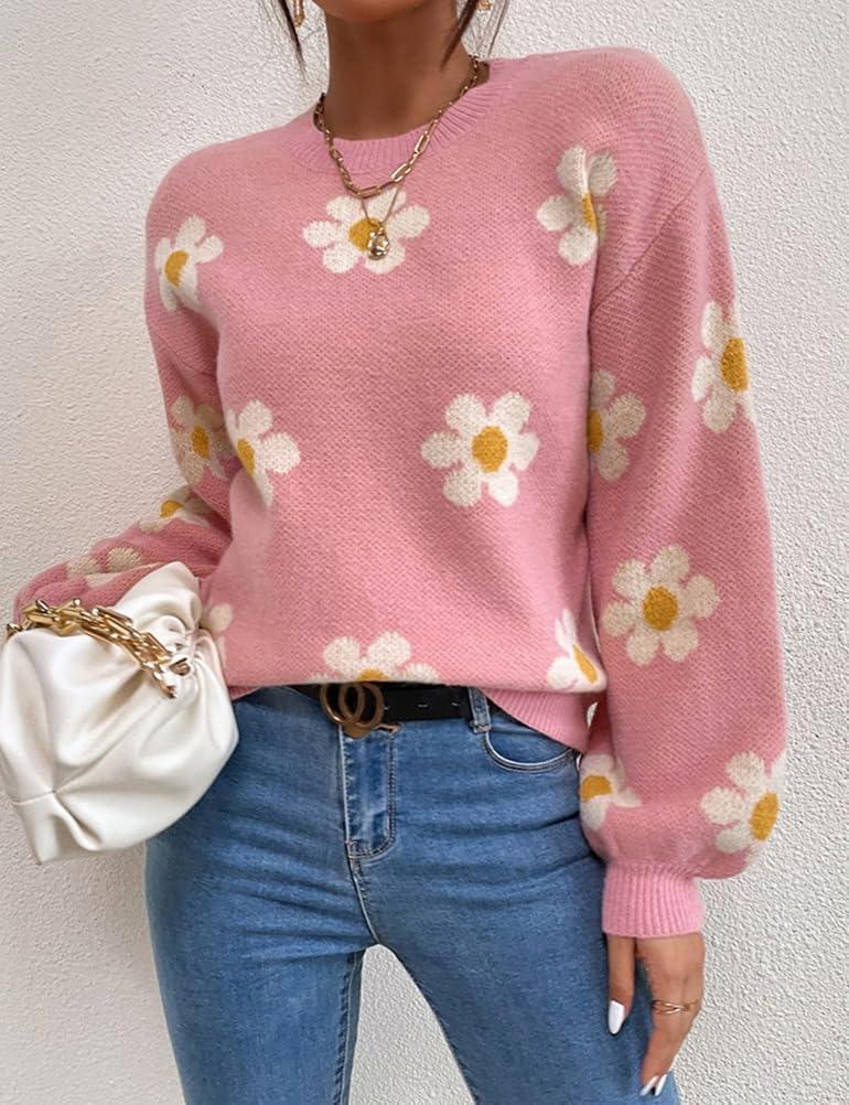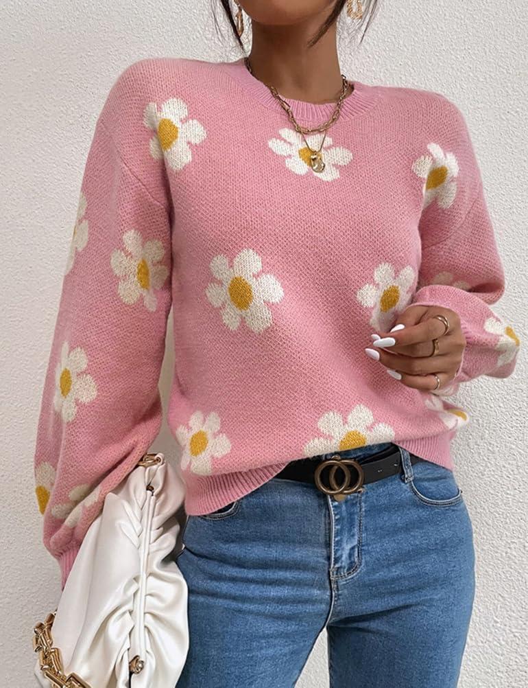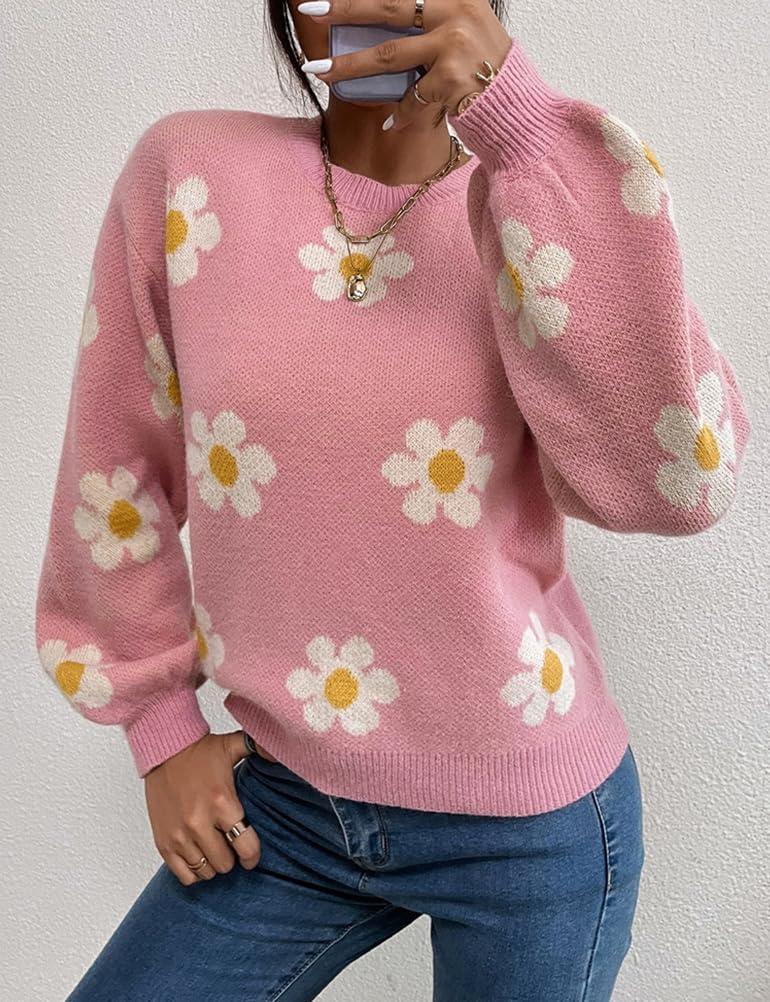 Womens Daisy Sweater Fall Winter Long Sleeve Pullover Loose Fit Flower Knit Sweater Tops(Pink)